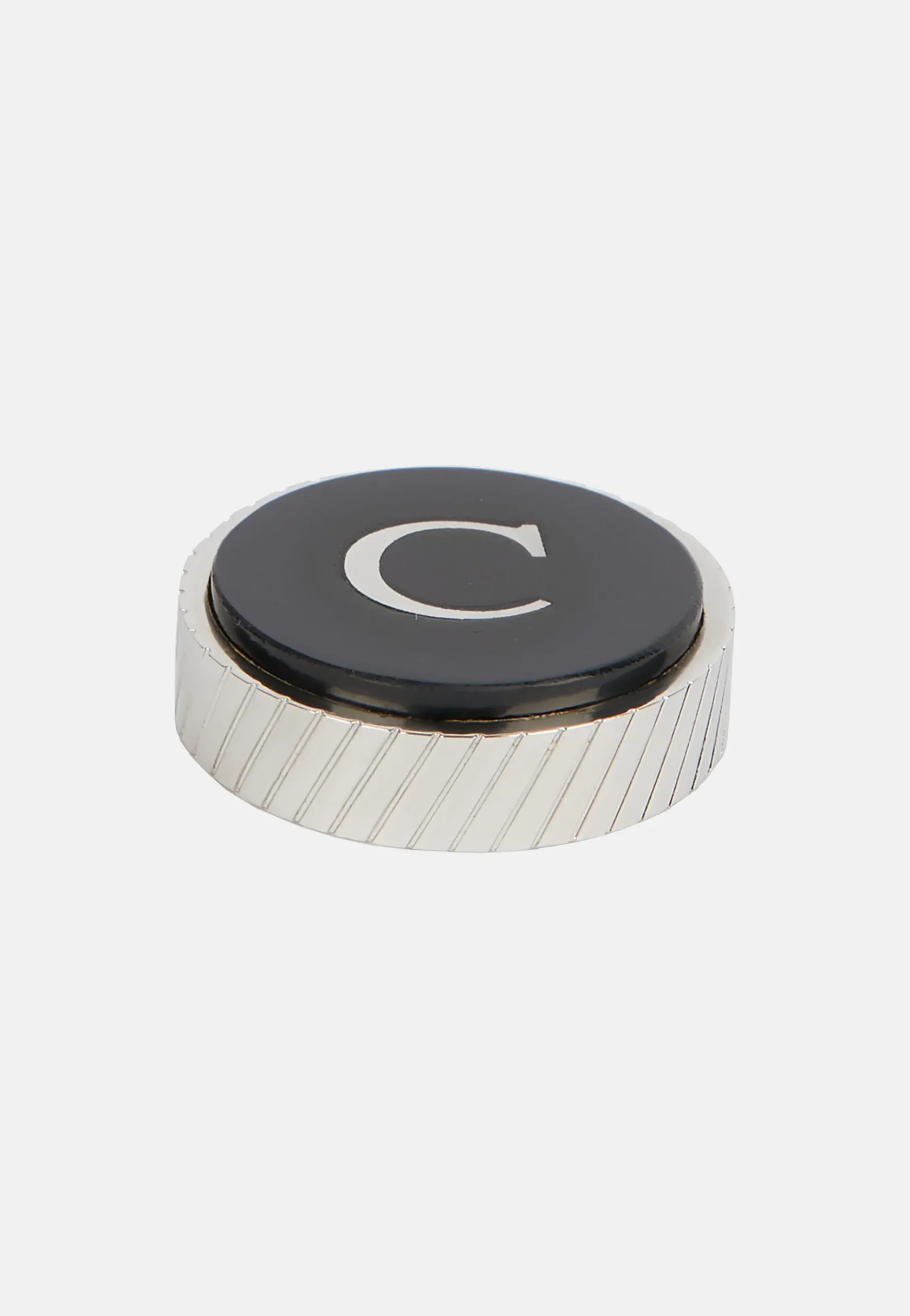 il se caractérise par la lettre émaillée sur fond noir, à appliquer sur la base spéciale pour boutons de manchette en métal.