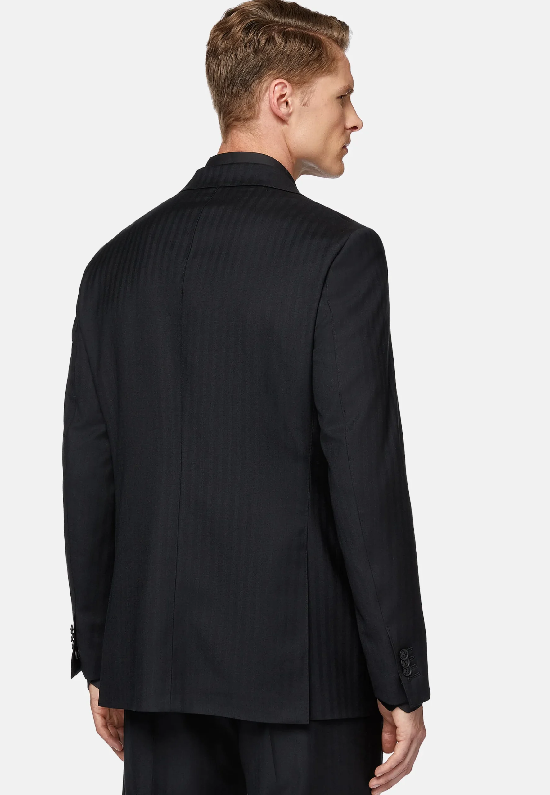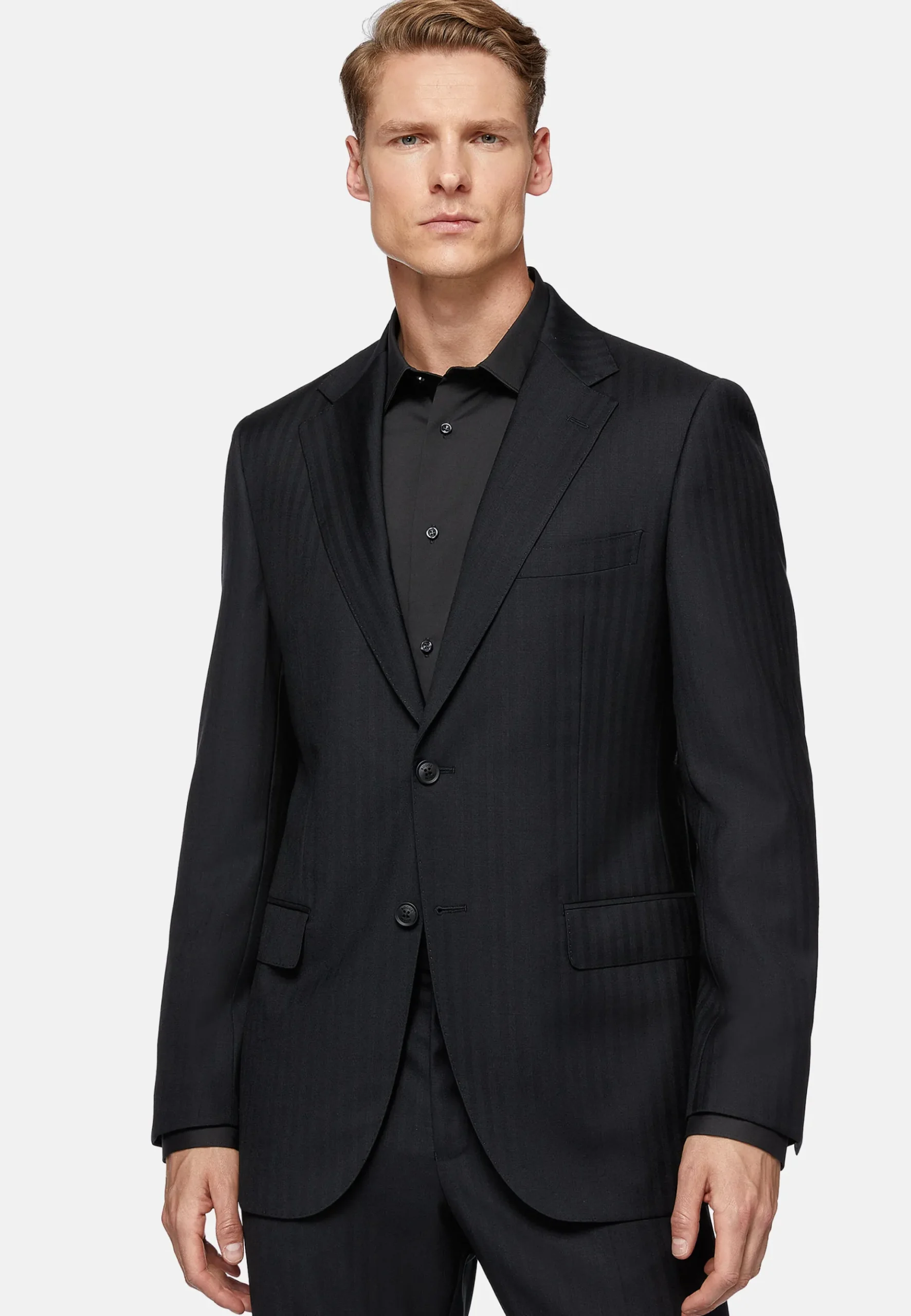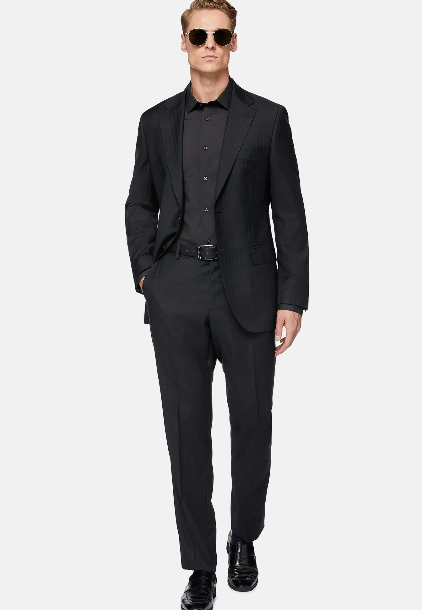 Costume coupe droite, confection semi-entoilée, à simple boutonnage, entièrement doublé avec poches à rabat.
