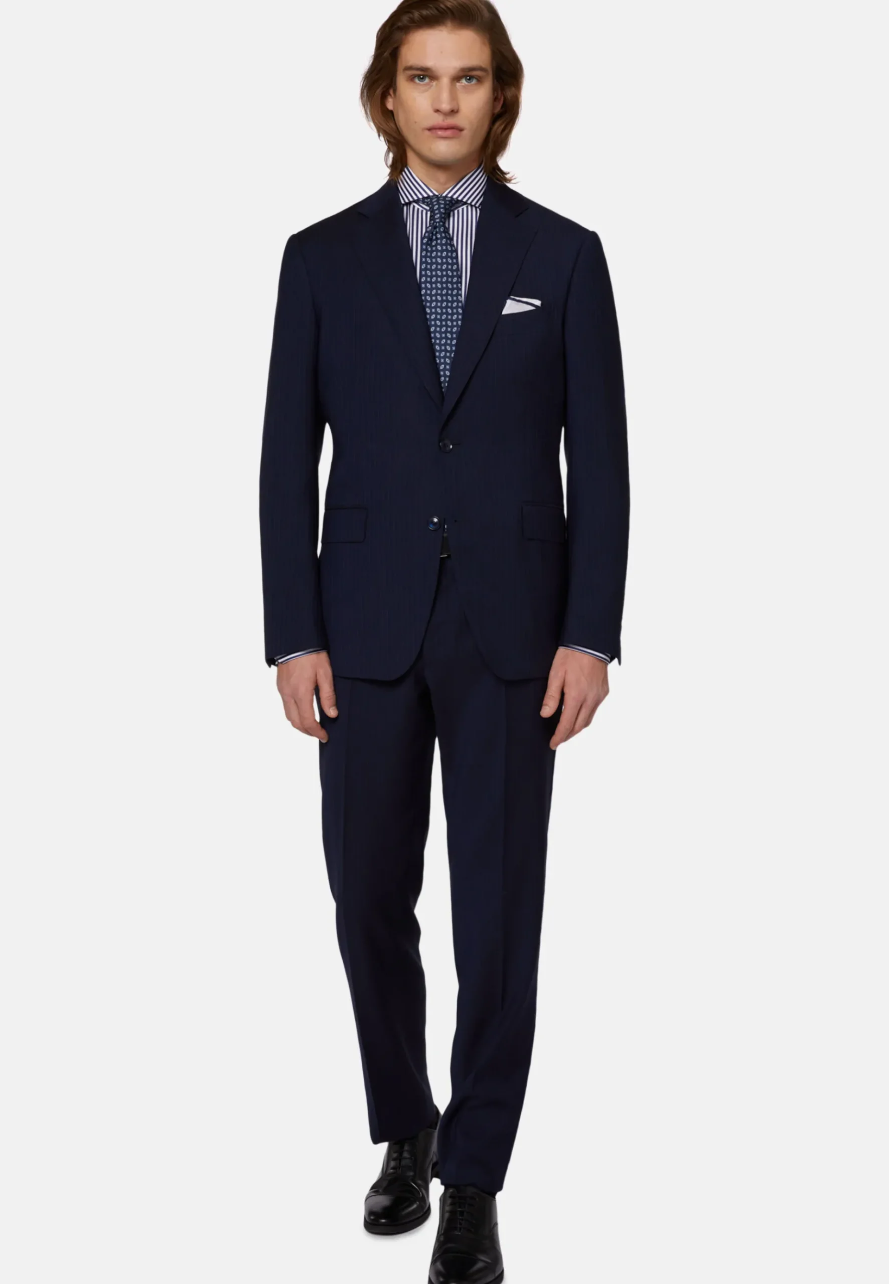 Costume coupe droite, construction entoilée, à simple boutonnage, entièrement doublé avec poches à rabat.