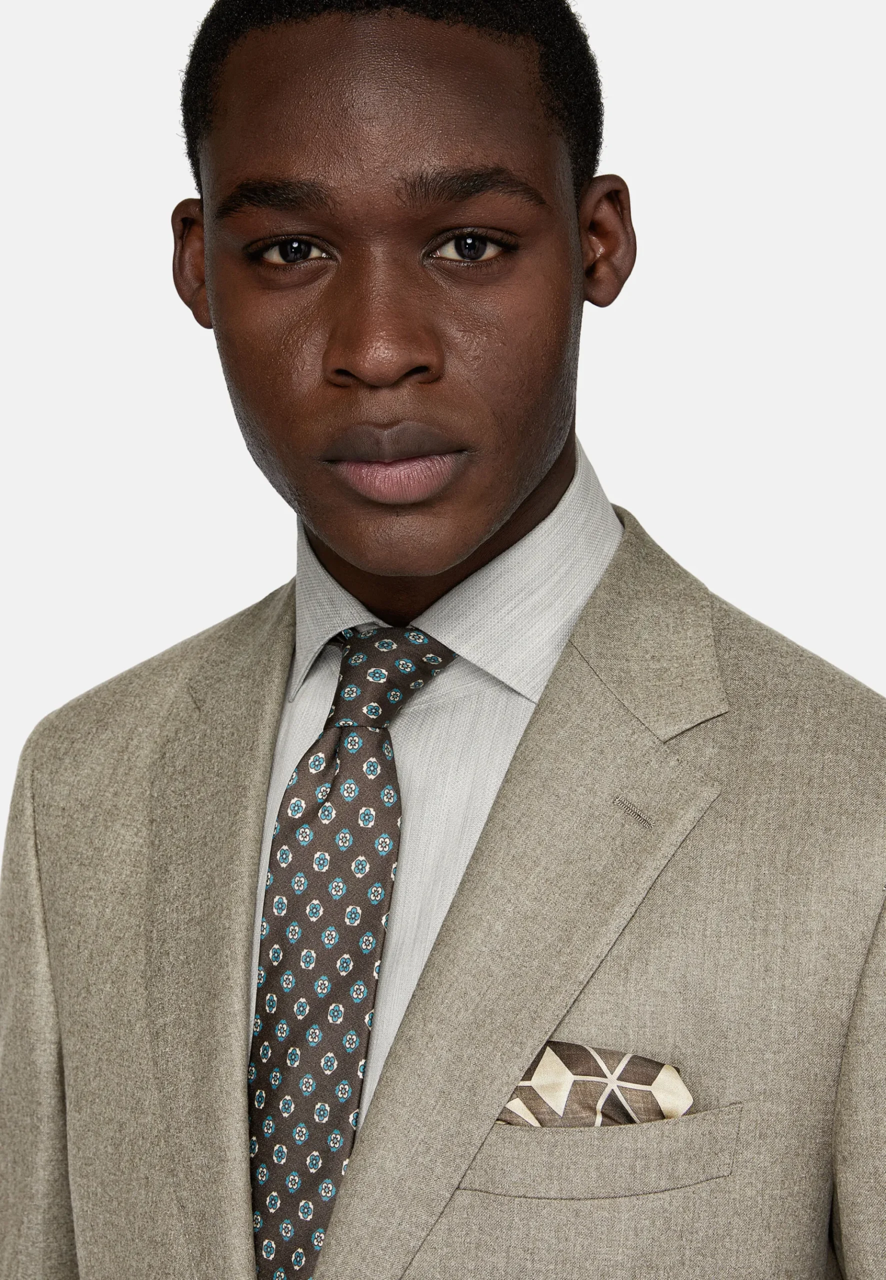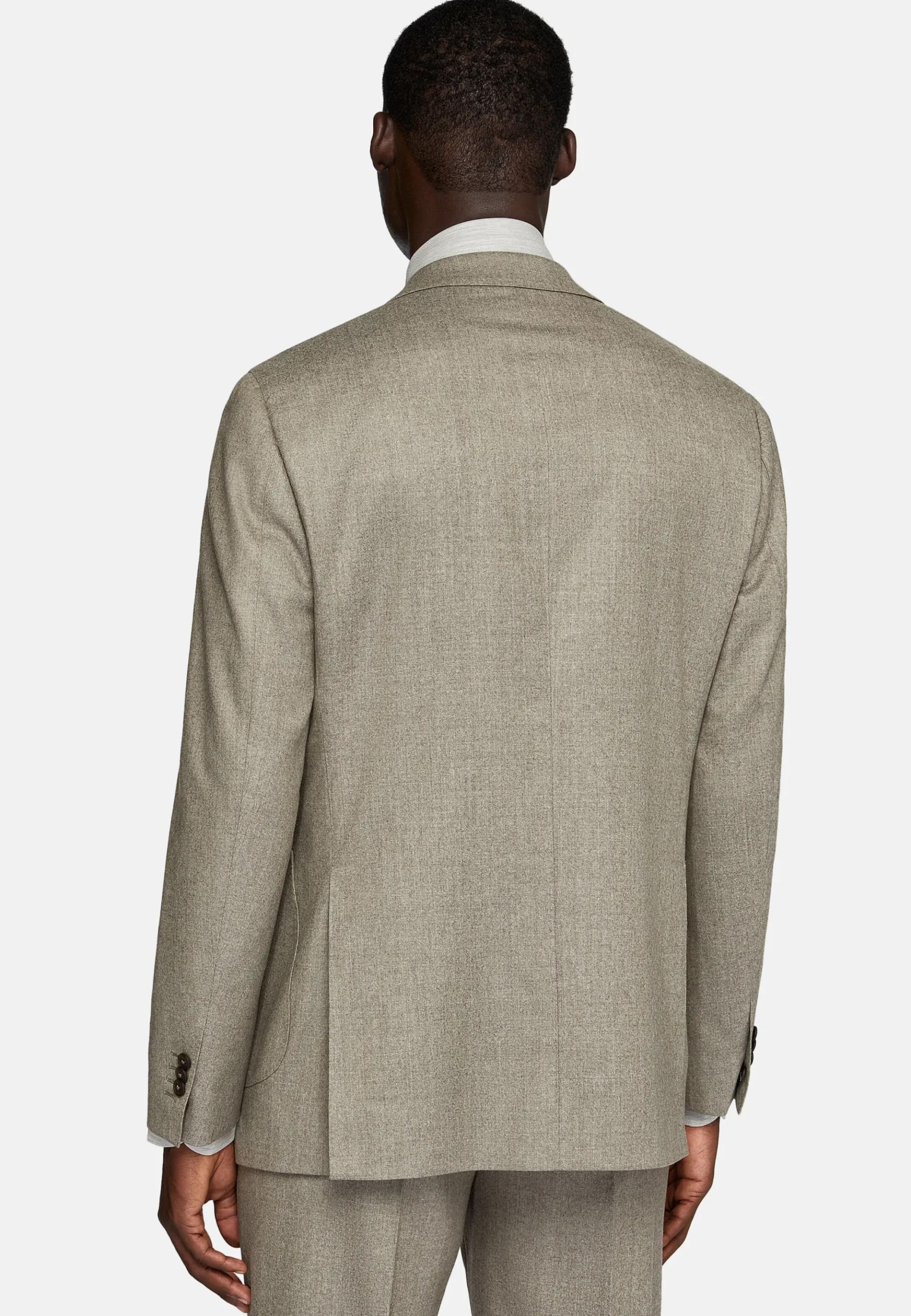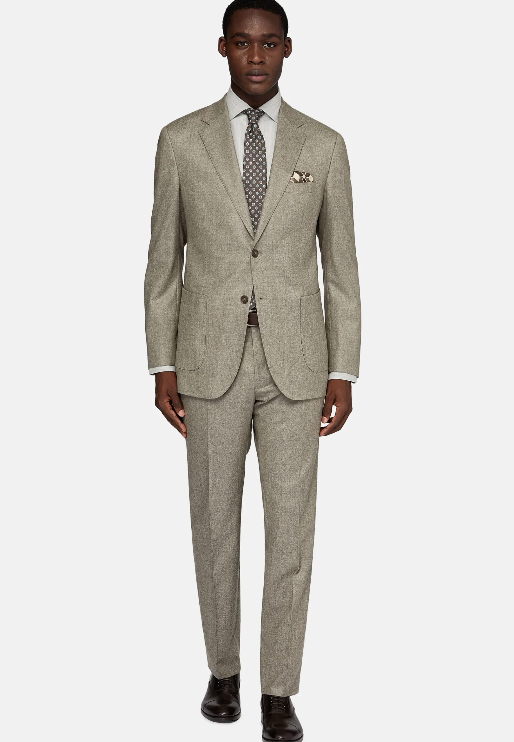 Costume regular fit, montage semi-entoilé, à simple boutonnage, entièrement doublé avec poches appliquées.