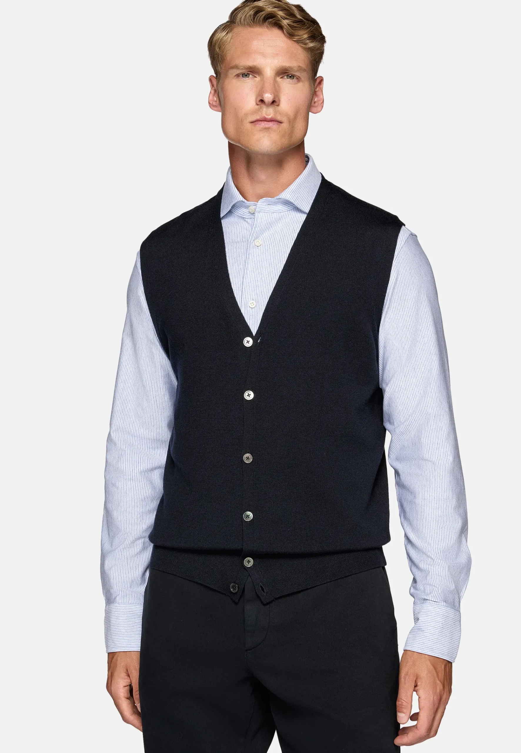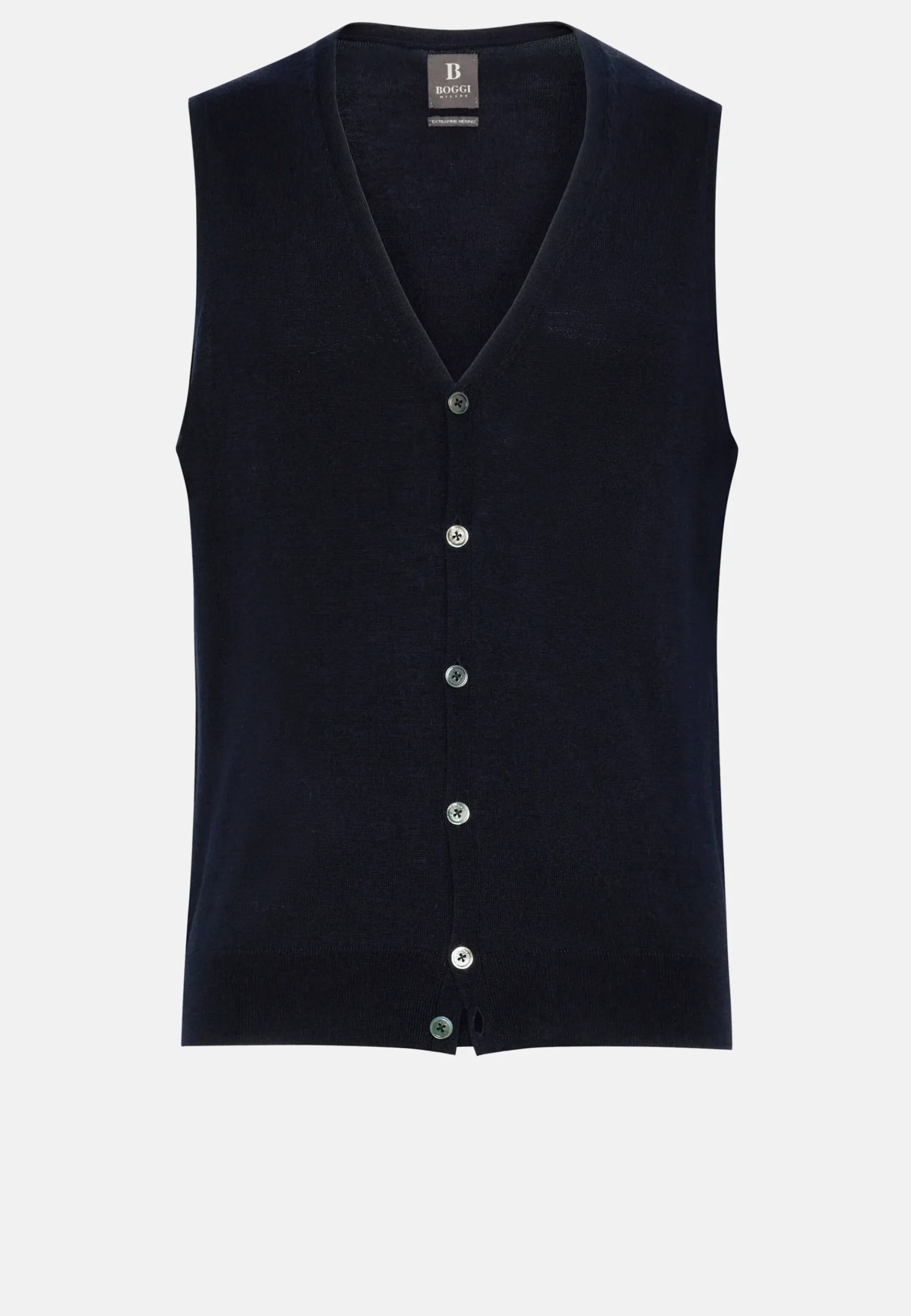 En pure laine mérinos extra-fine avec bouton en nacre marqué du logo.