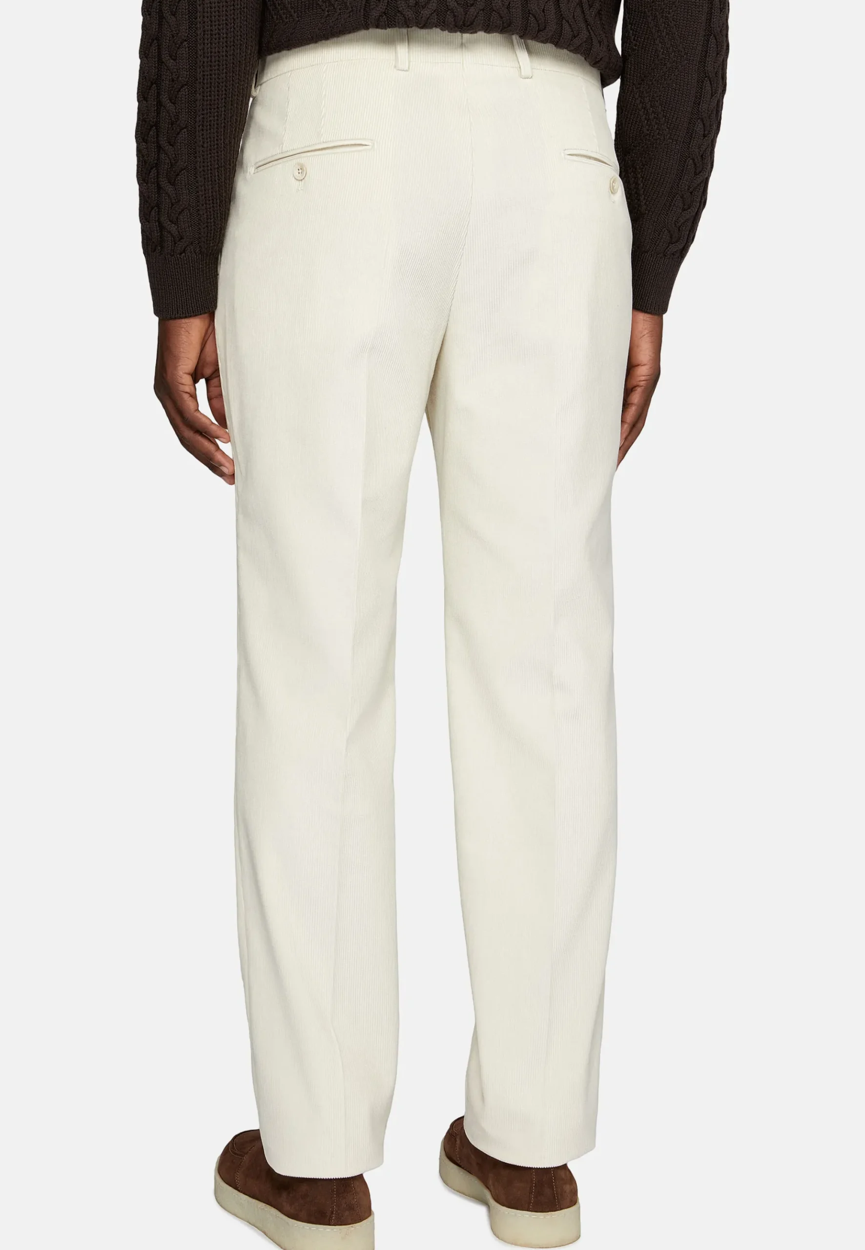 Fermeture avec bouton et zip, poches avant en biais et poches arrière.