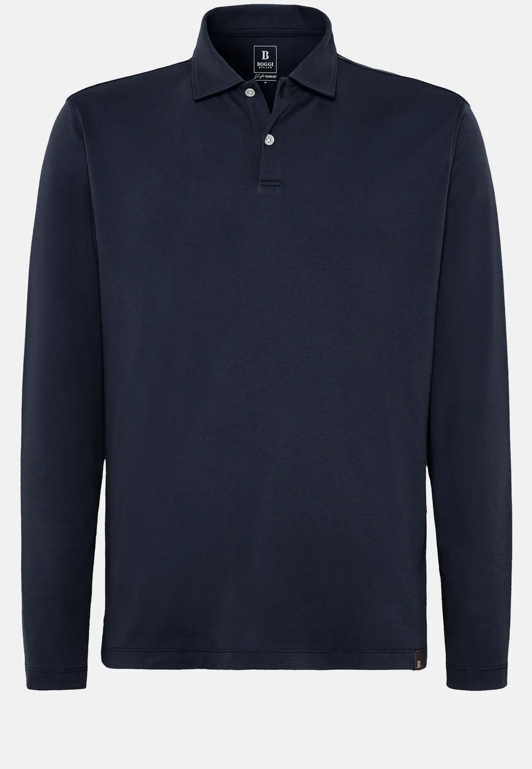 Ce modèle de polo présente des boutons en nacre avec logo, la broderie B Sustainable sur le côté gauche à l’arrière et le B de Boggi appliqué en bas à gauche du vêtement.