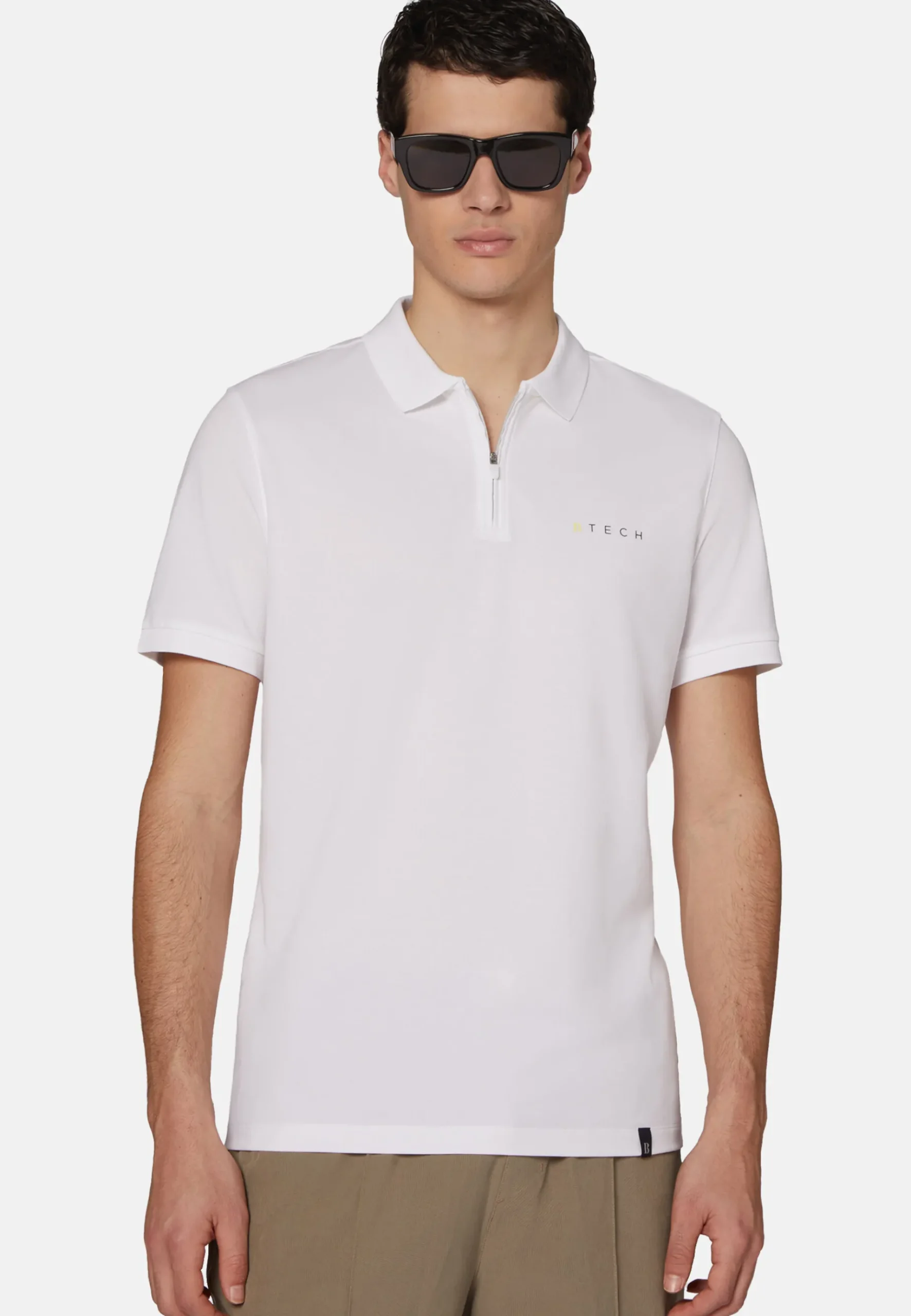 Ce modèle de polo présente un zip à l’avant avec tirette marquée du logo, une impression en caoutchouc du logo B Tech sur la poitrine, la broderie B Sustainable sur le côté arrière gauche et le B de Boggi appliqué à gauche en bas du vêtement.