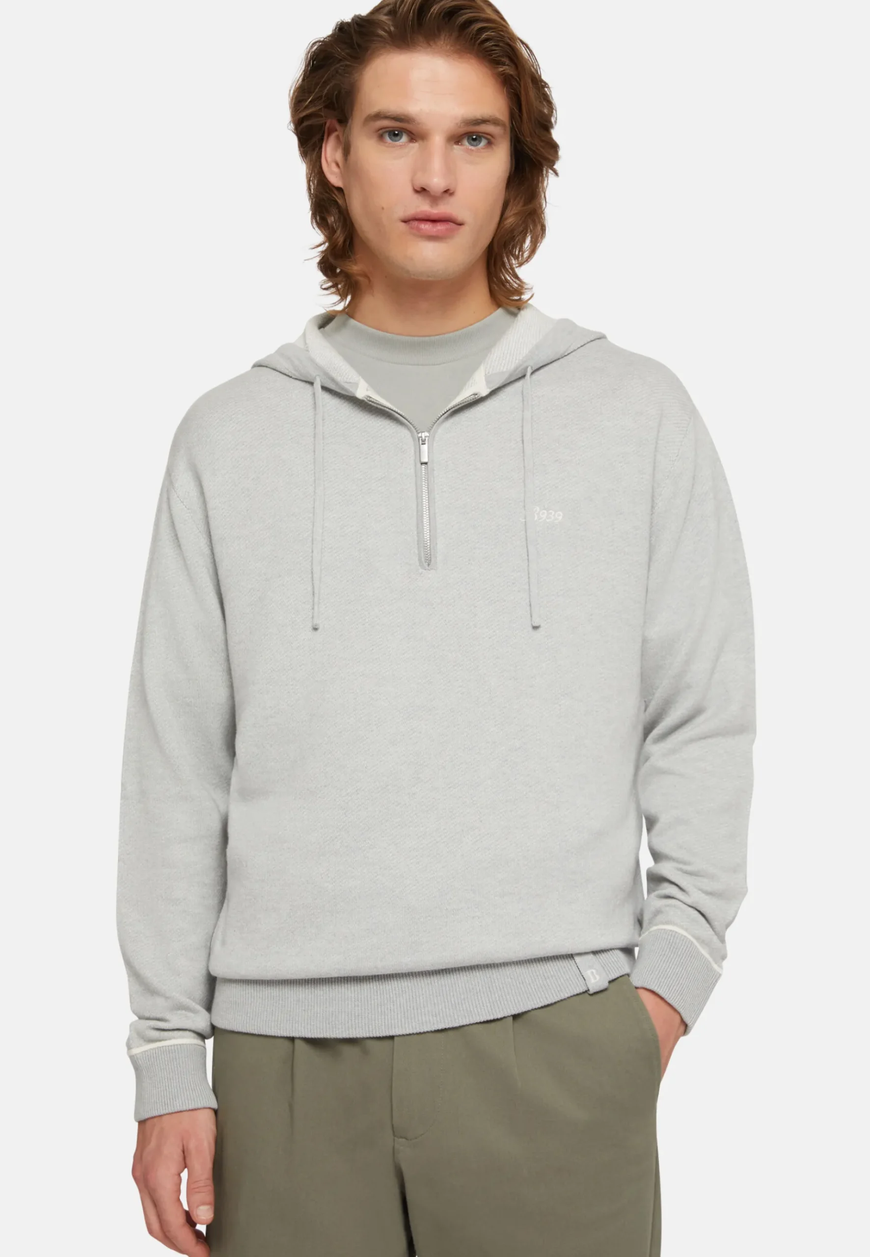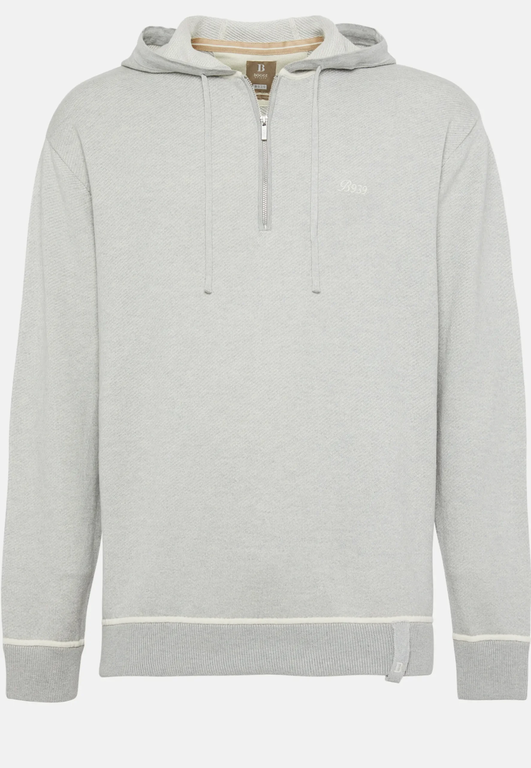 Le modèle présente une étiquette tissée en bas à gauche du vêtement avec le B di Boggi brodé en contraste.