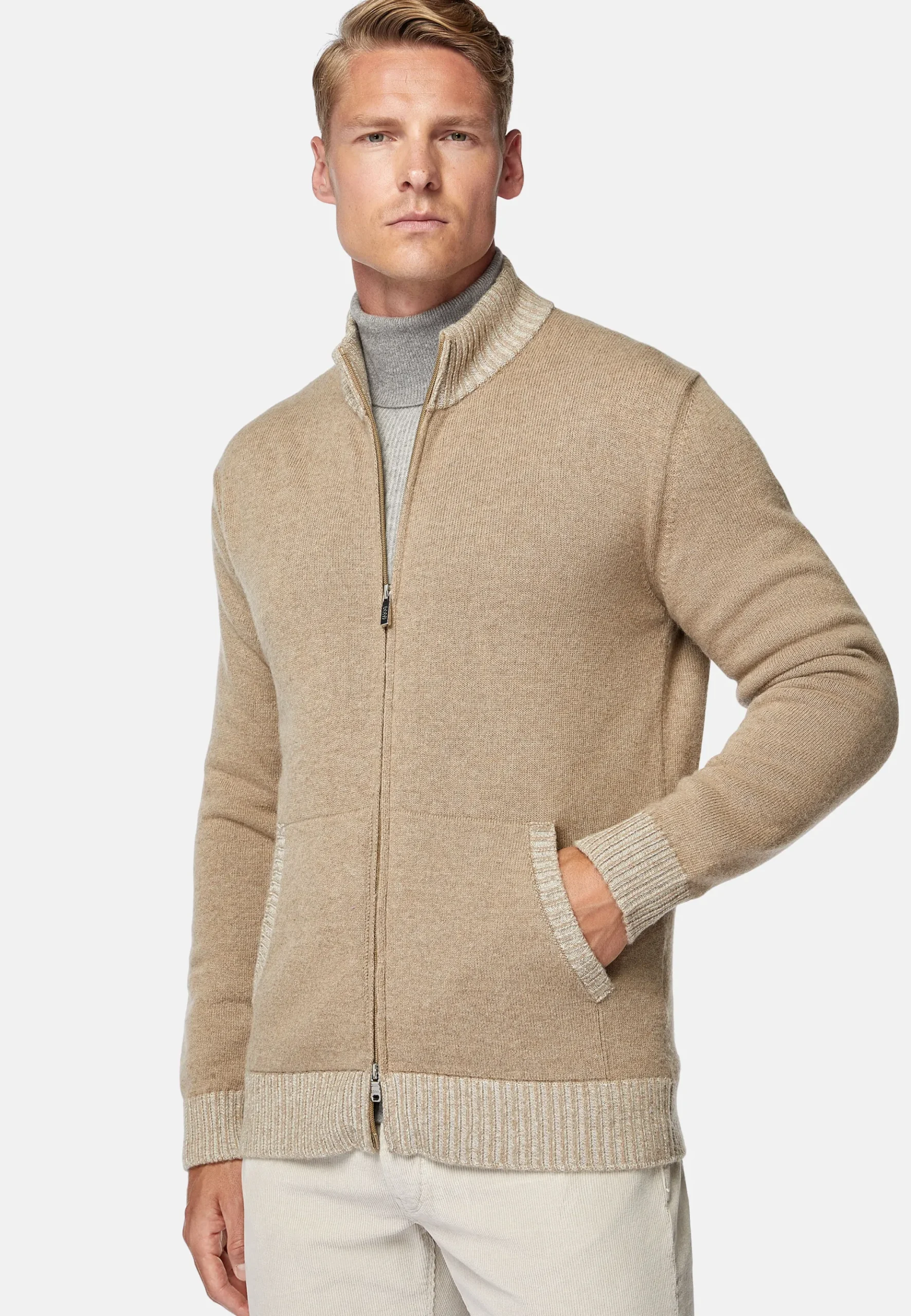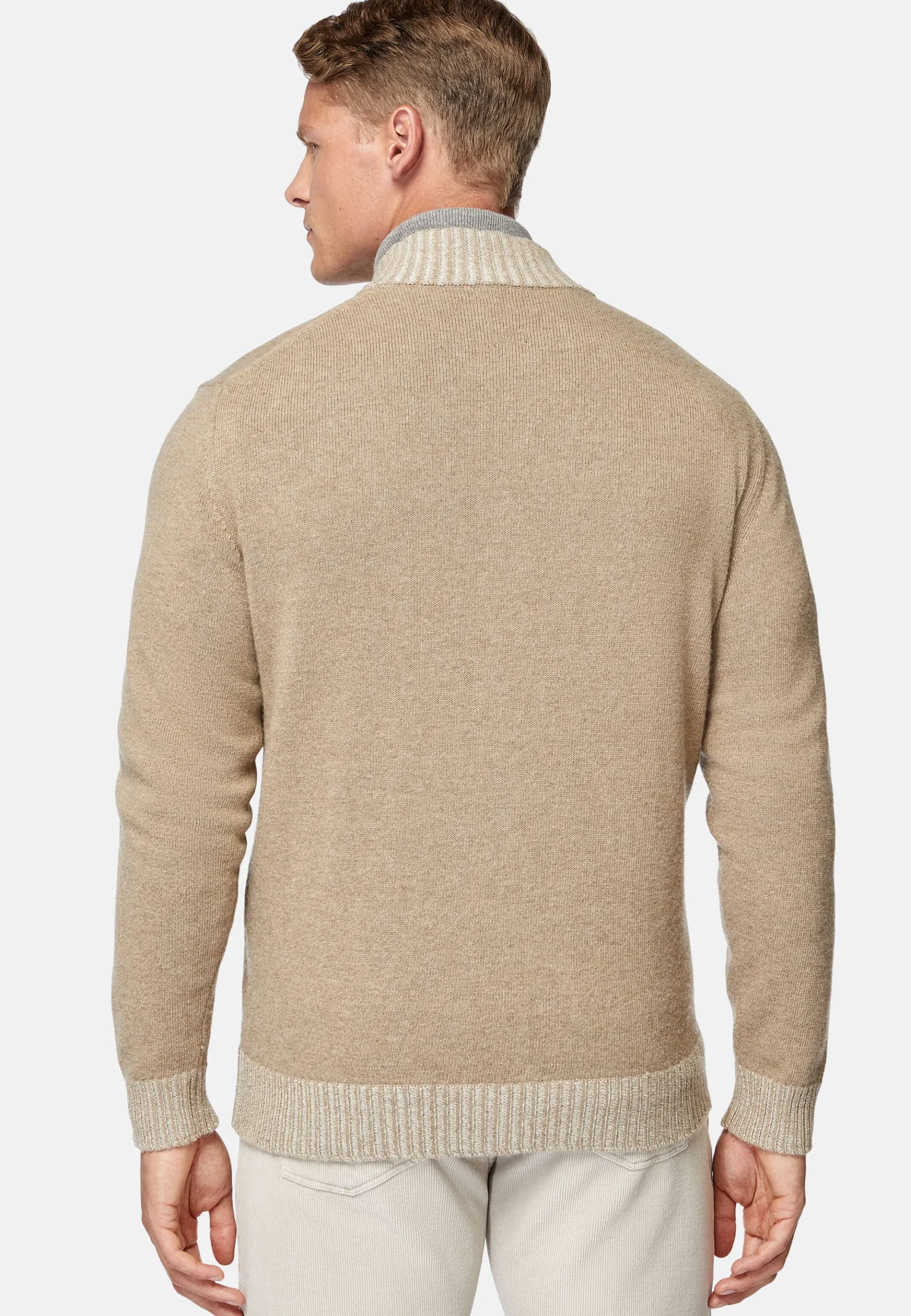 Le vêtement présente des finitions en côtes anglaises vanisées aux poignets et au bas.