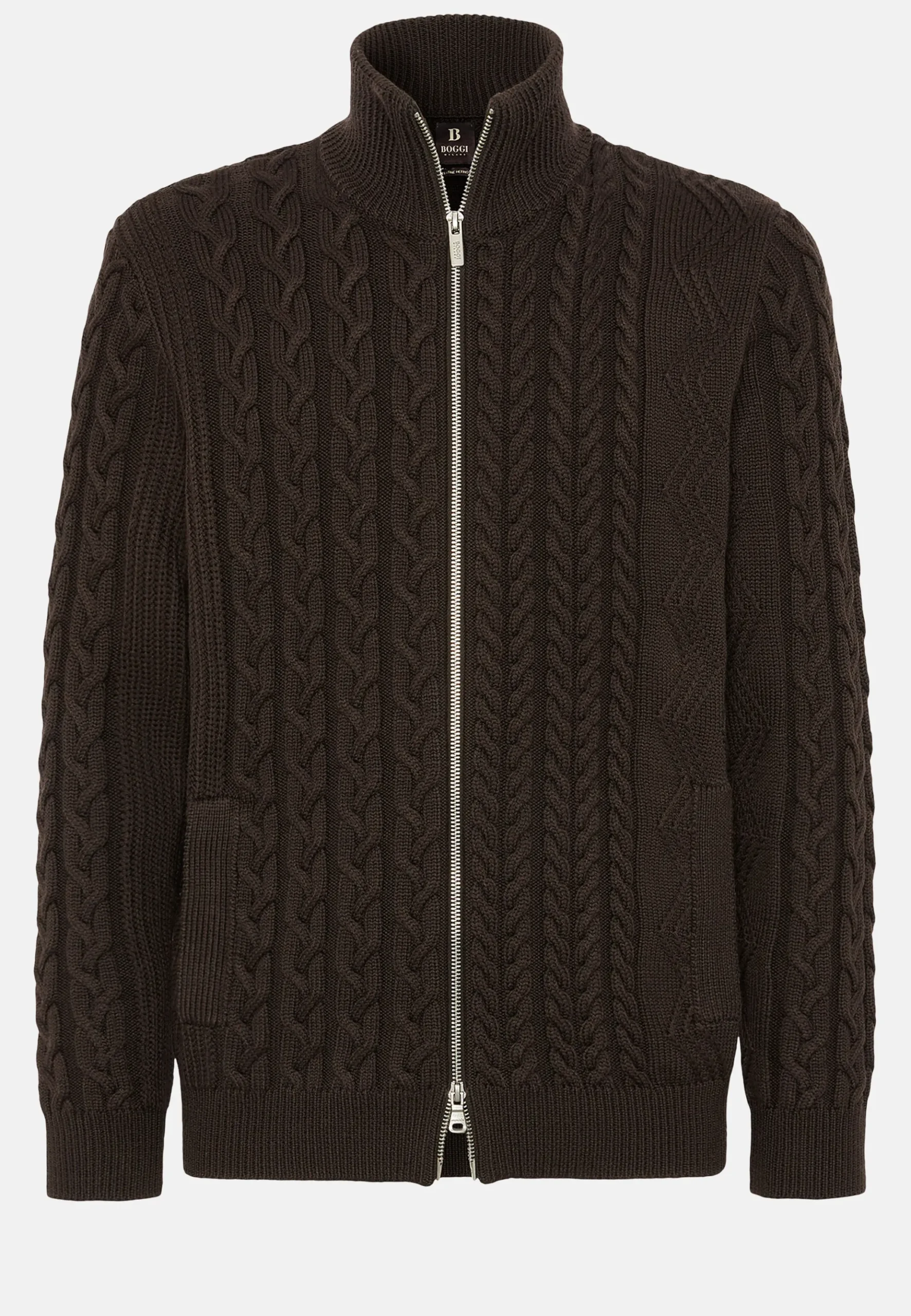 Le vêtement présente un tricot avec torsades et mélange de points, et une fermeture zippée avec tirettes logotées.