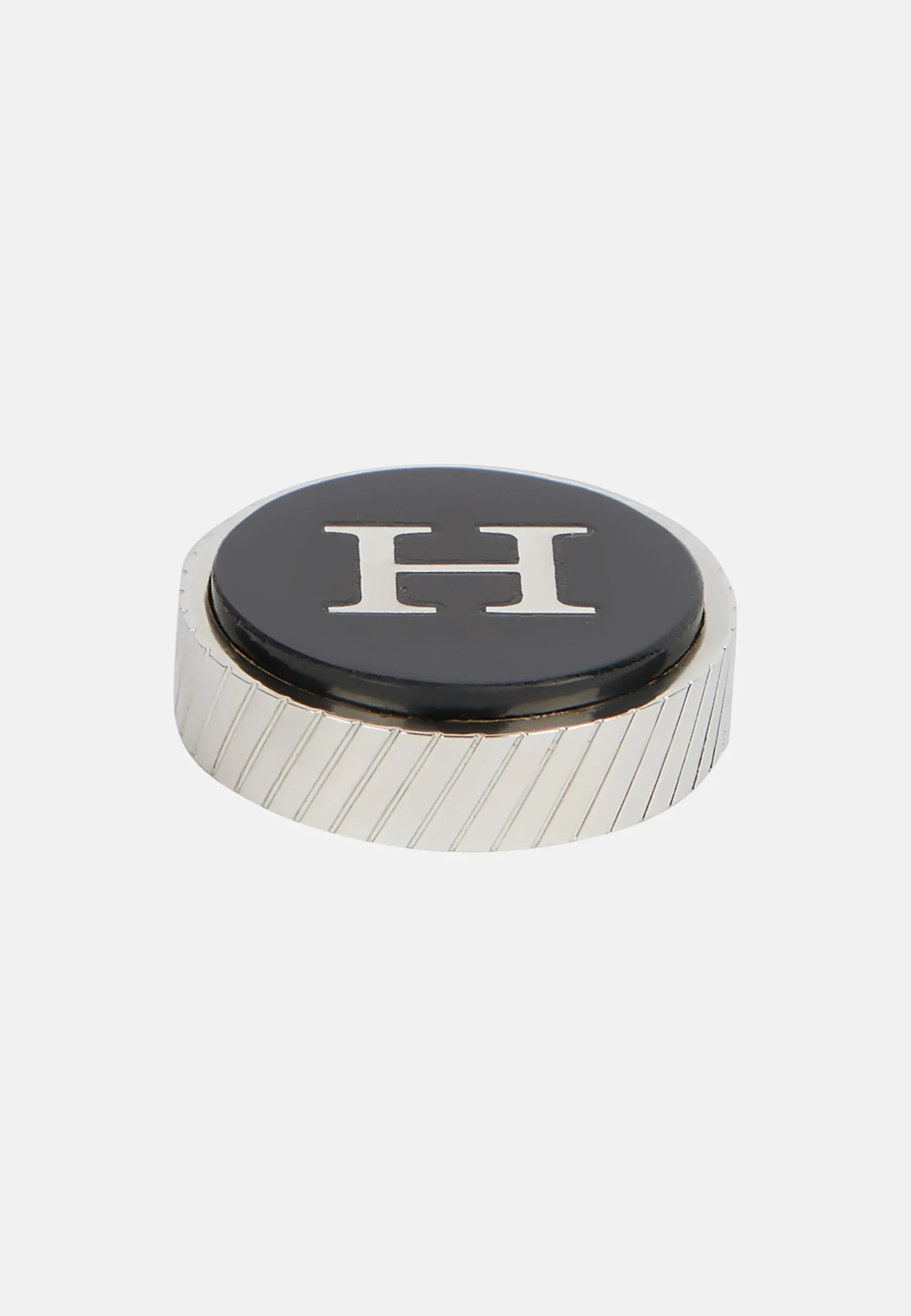 il se caractérise par la lettre émaillée sur fond noir, à appliquer sur la base spéciale pour boutons de manchette en métal.