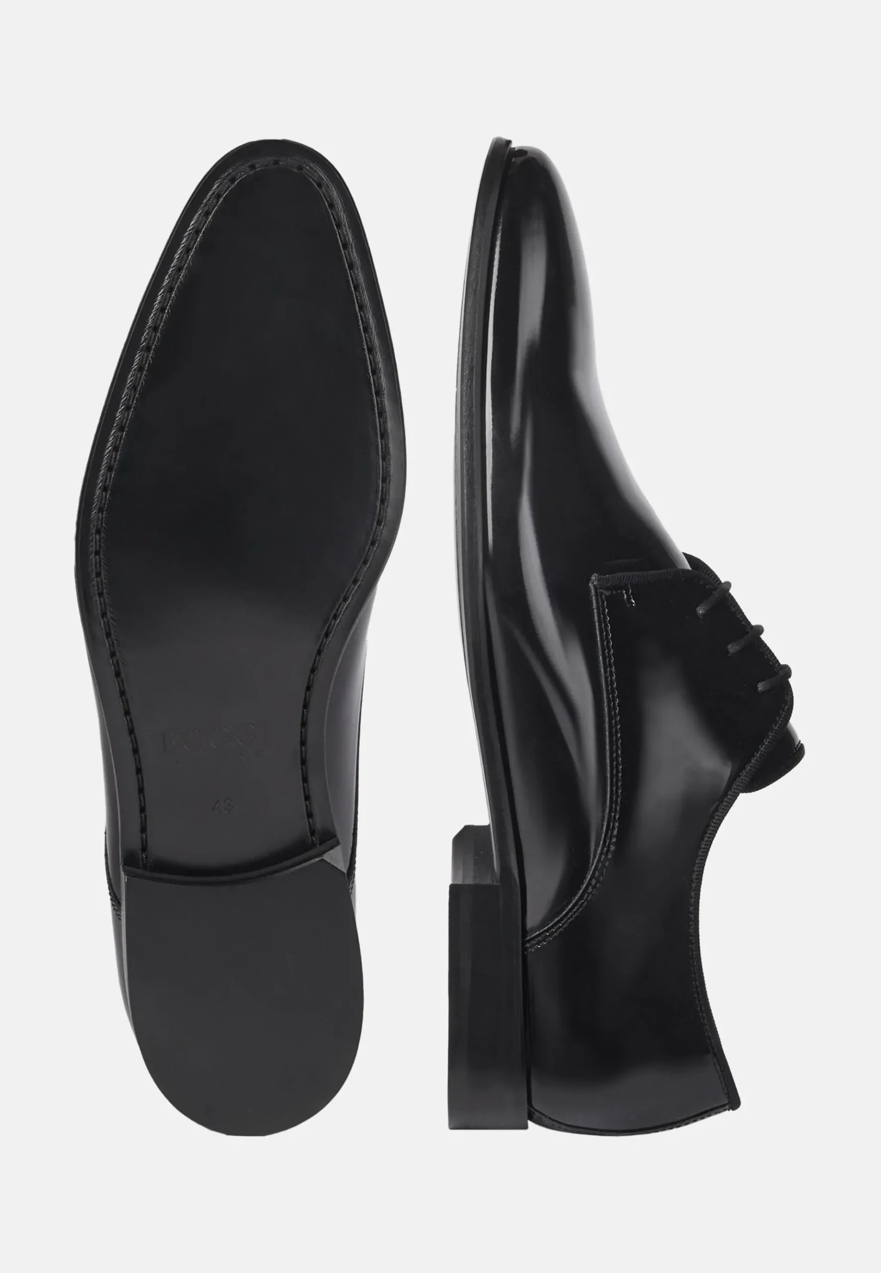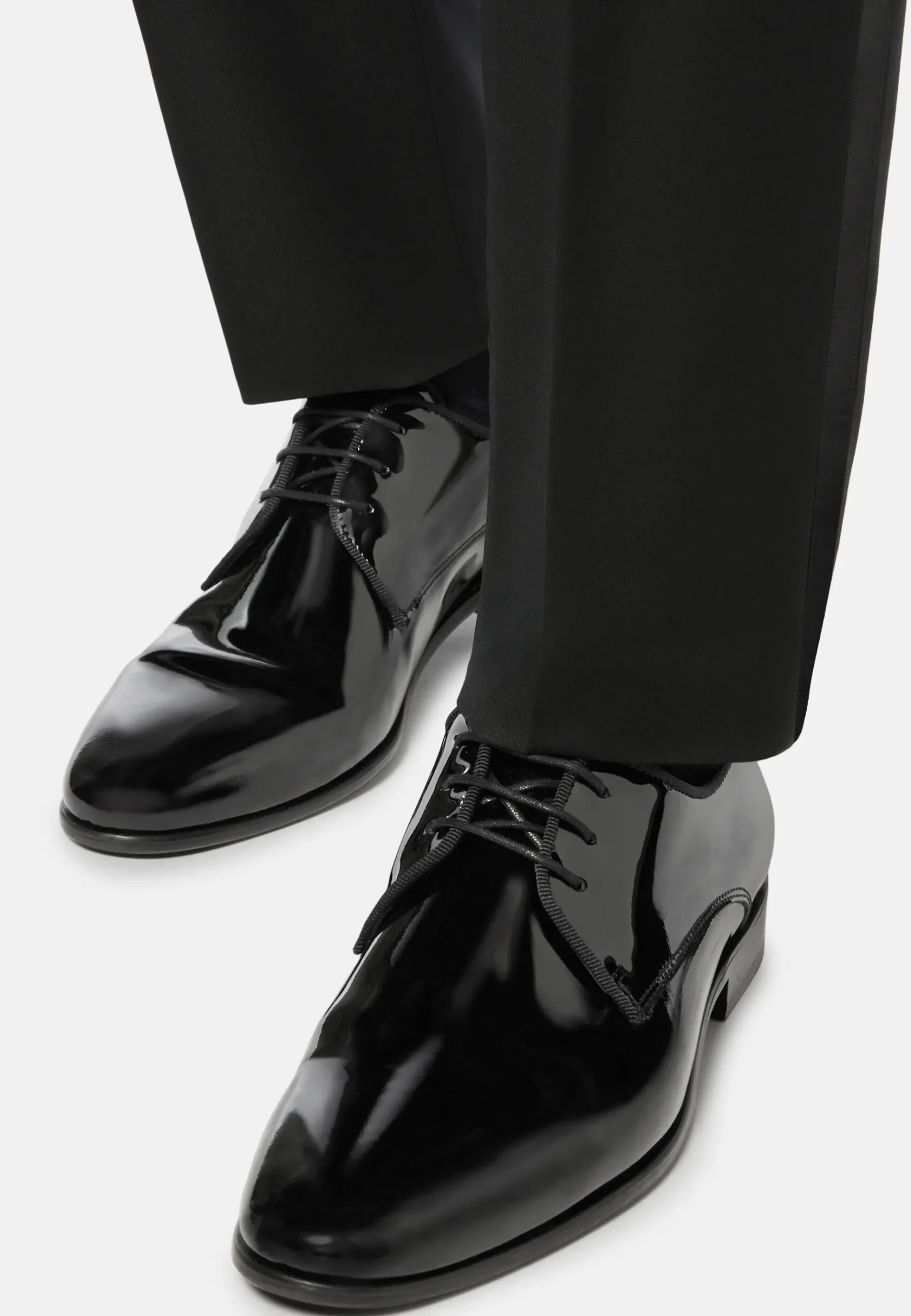 Finition en cuir verni brillant, doublure en cuir, lacets cirés et semelle en cuir.