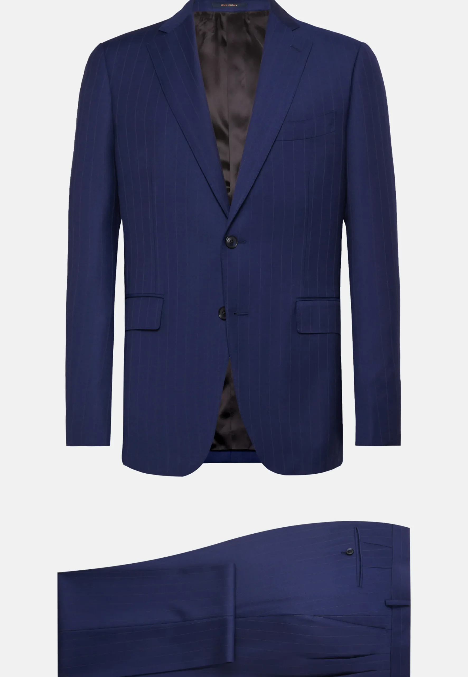 Costume de coupe classique avec construction entoilée, simple boutonnage, entièrement doublé et avec poches à rabat.