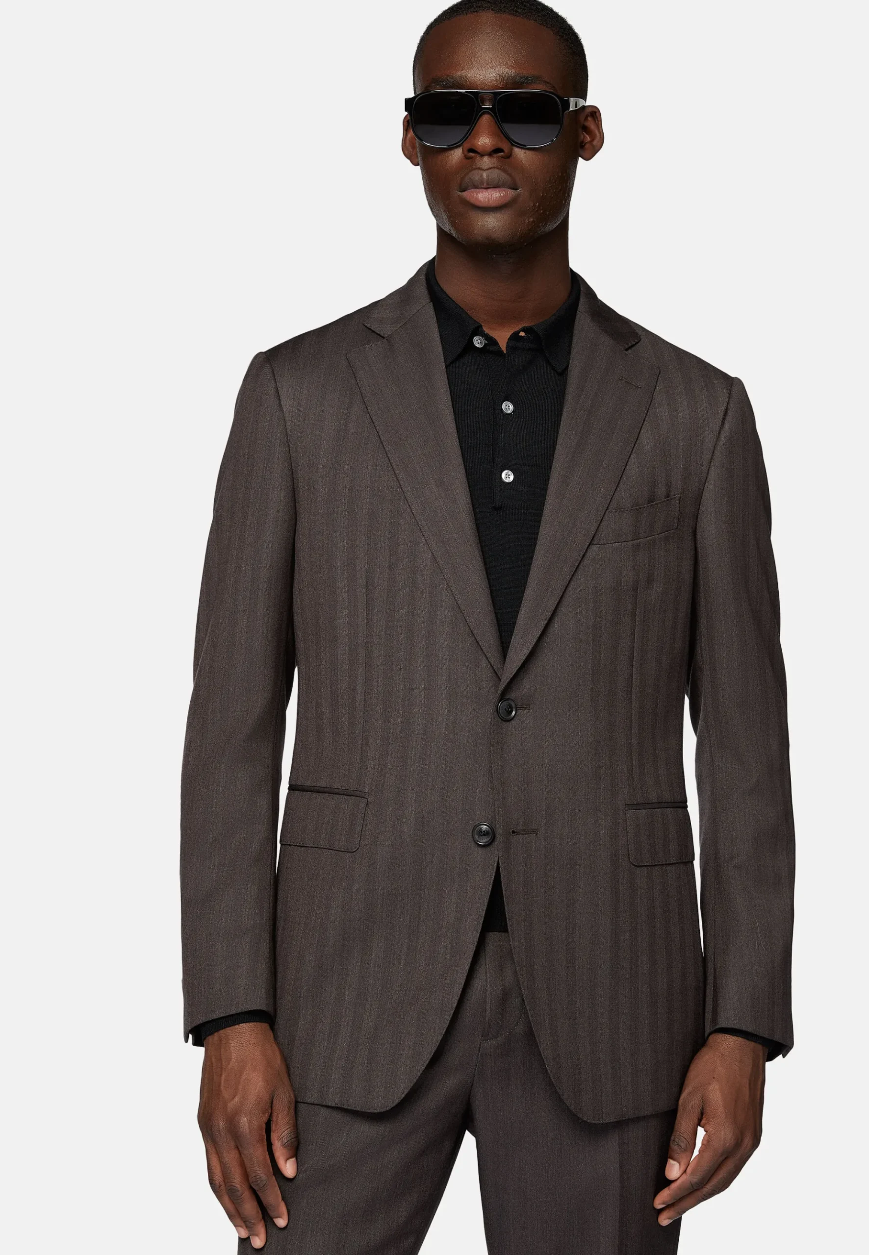 Costume de coupe classique avec construction entoilée, simple boutonnage, entièrement doublé et avec poches à rabat.