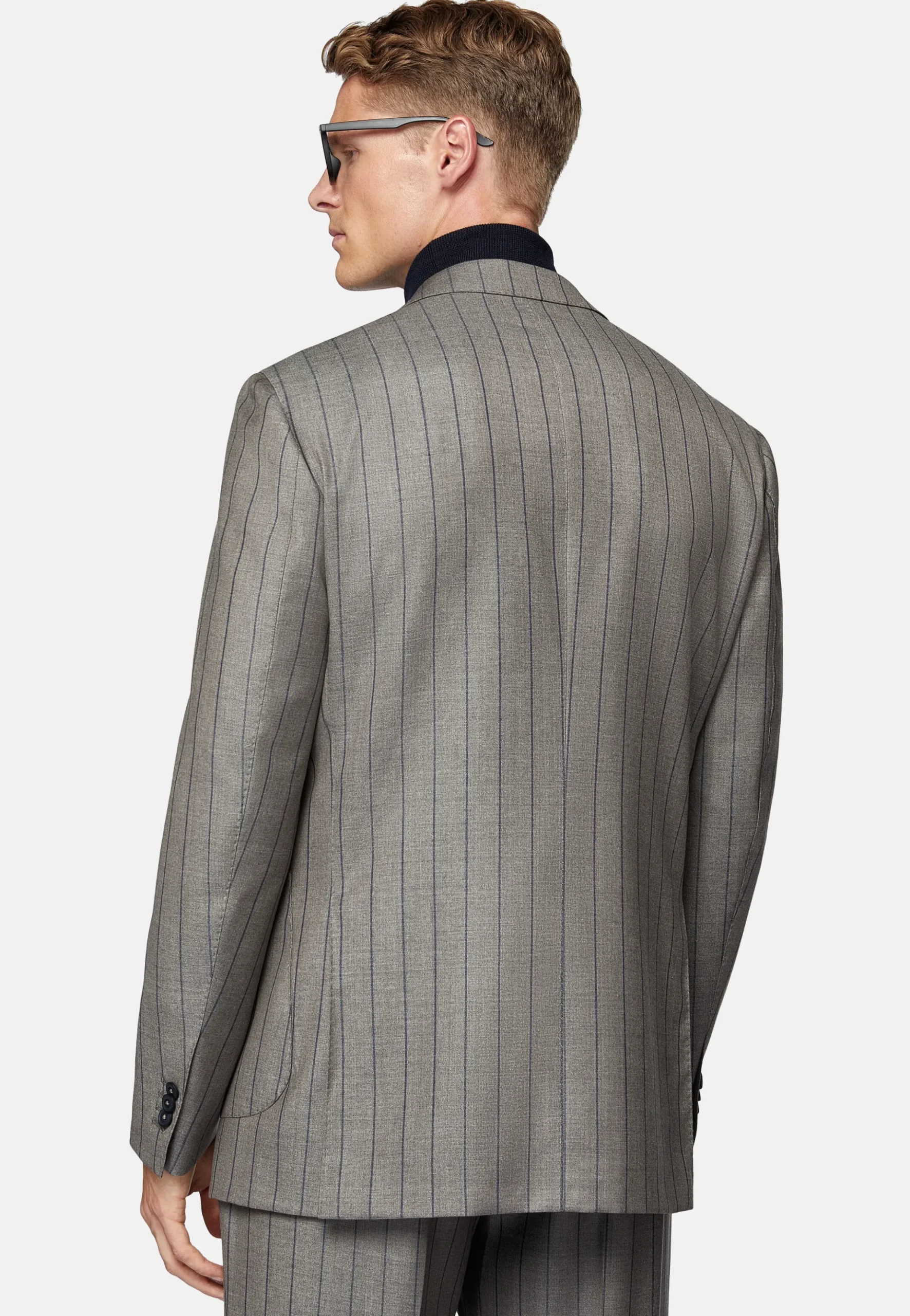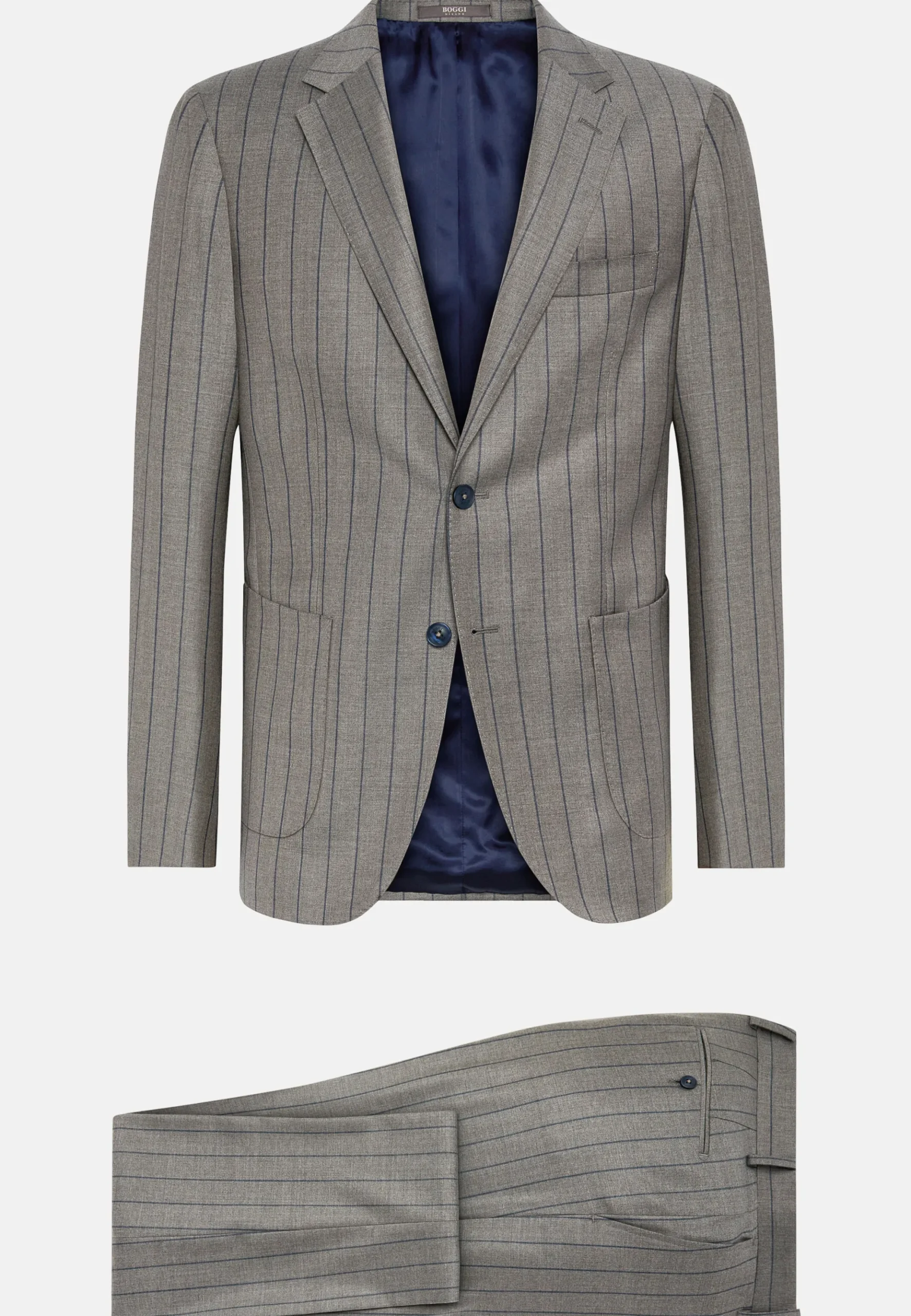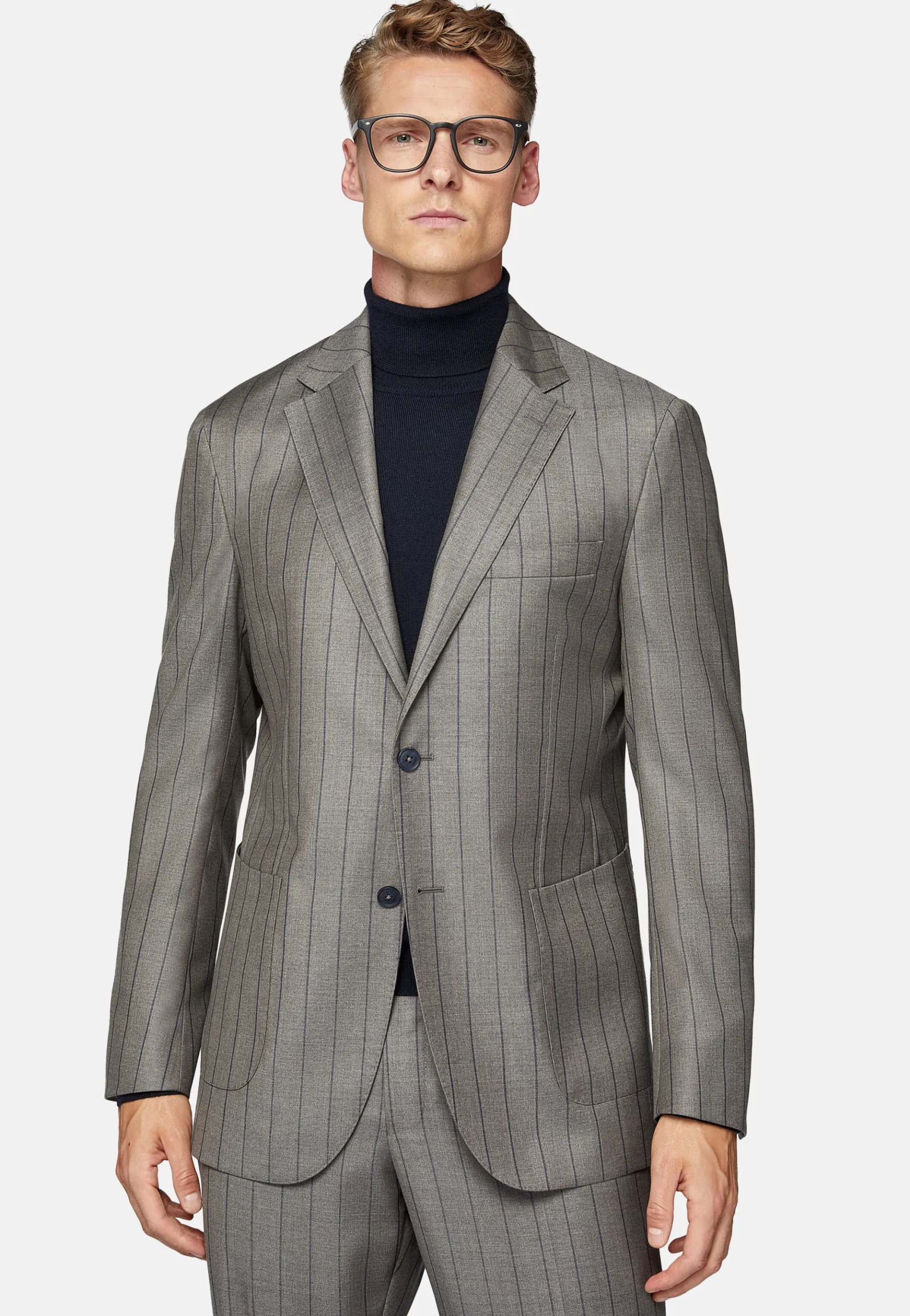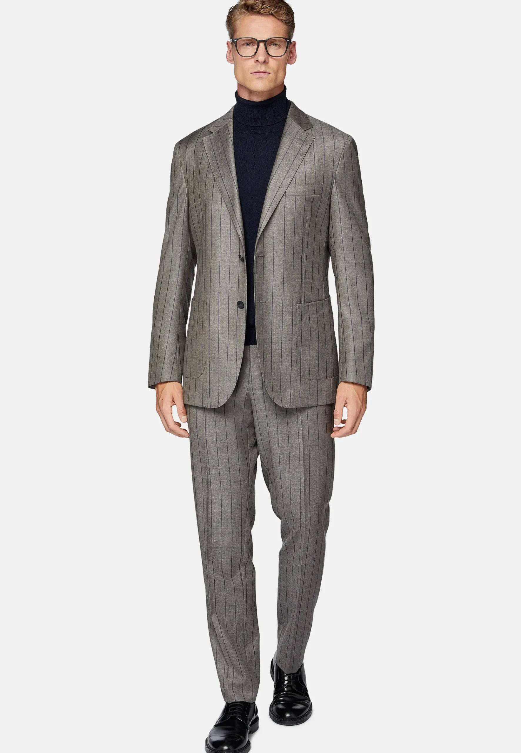Costume regular fit, montage semi-entoilé, à simple boutonnage, entièrement doublé avec poches appliquées.