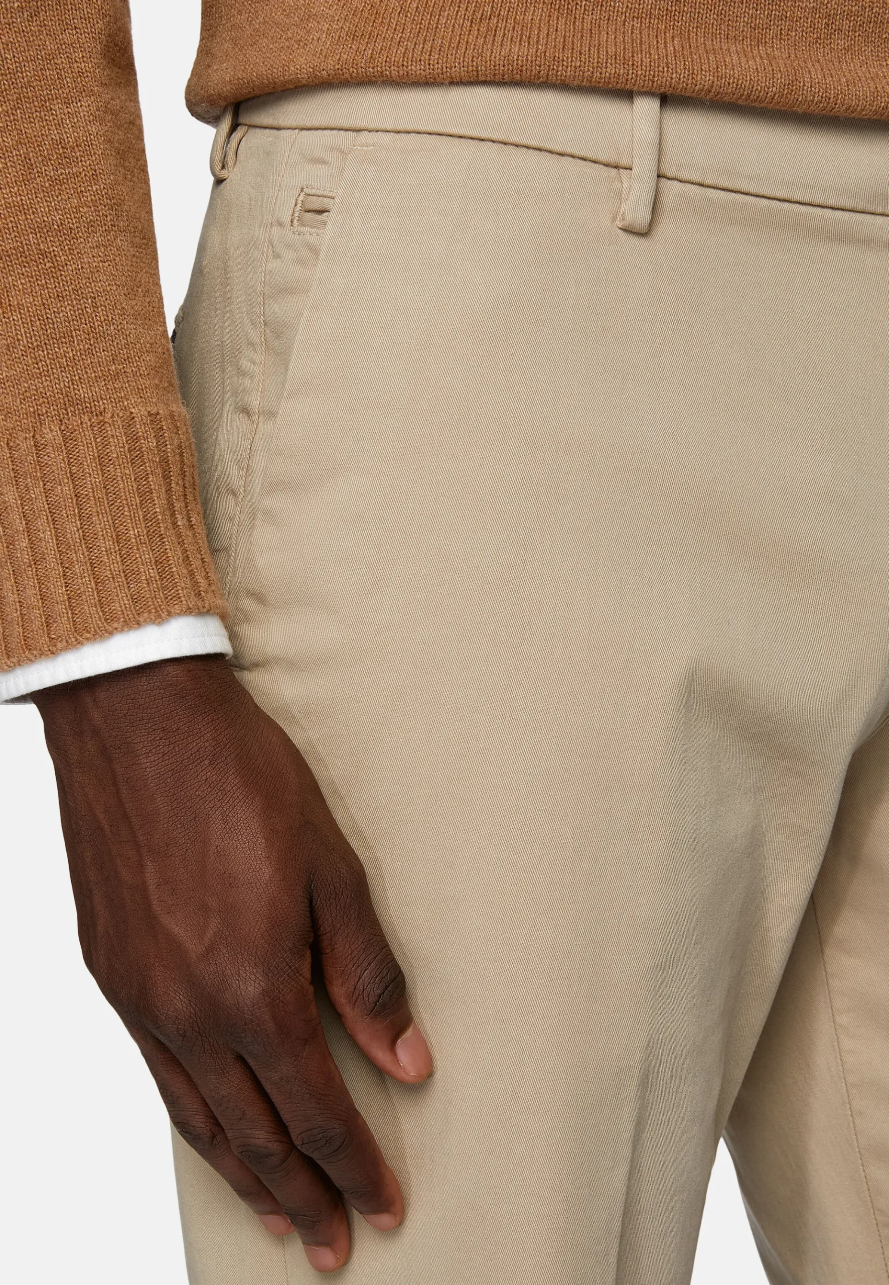 Fermeture avec bouton et zip, poches avant en biais et poches arrière.