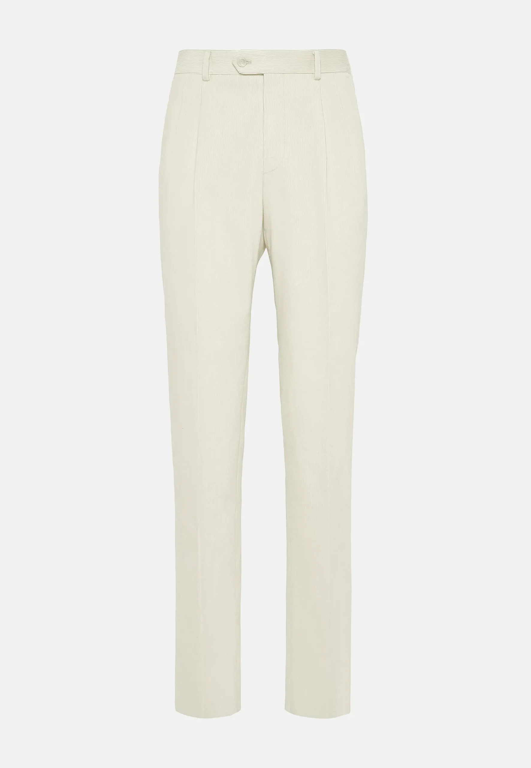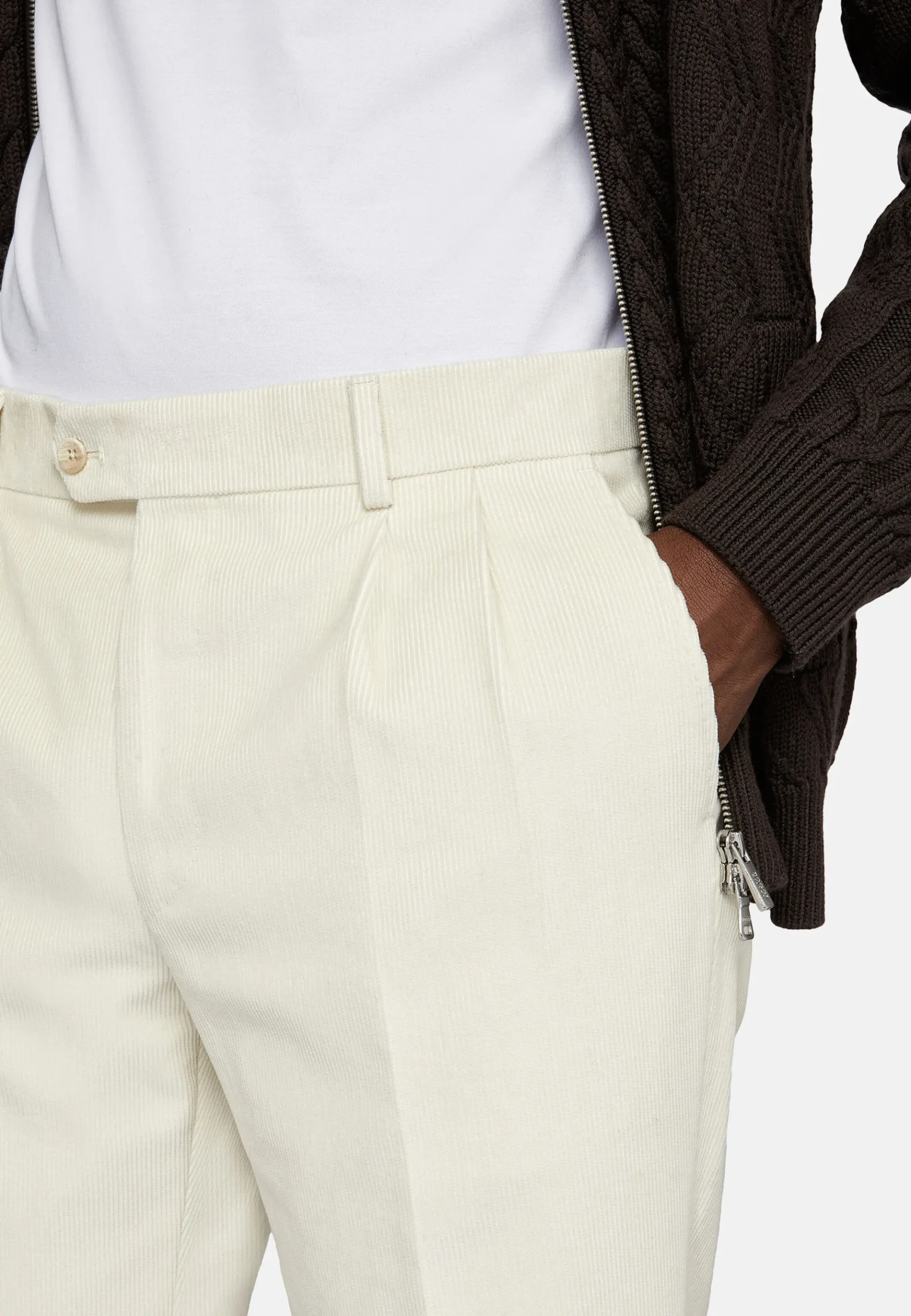 Fermeture avec bouton et zip, poches avant en biais et poches arrière.