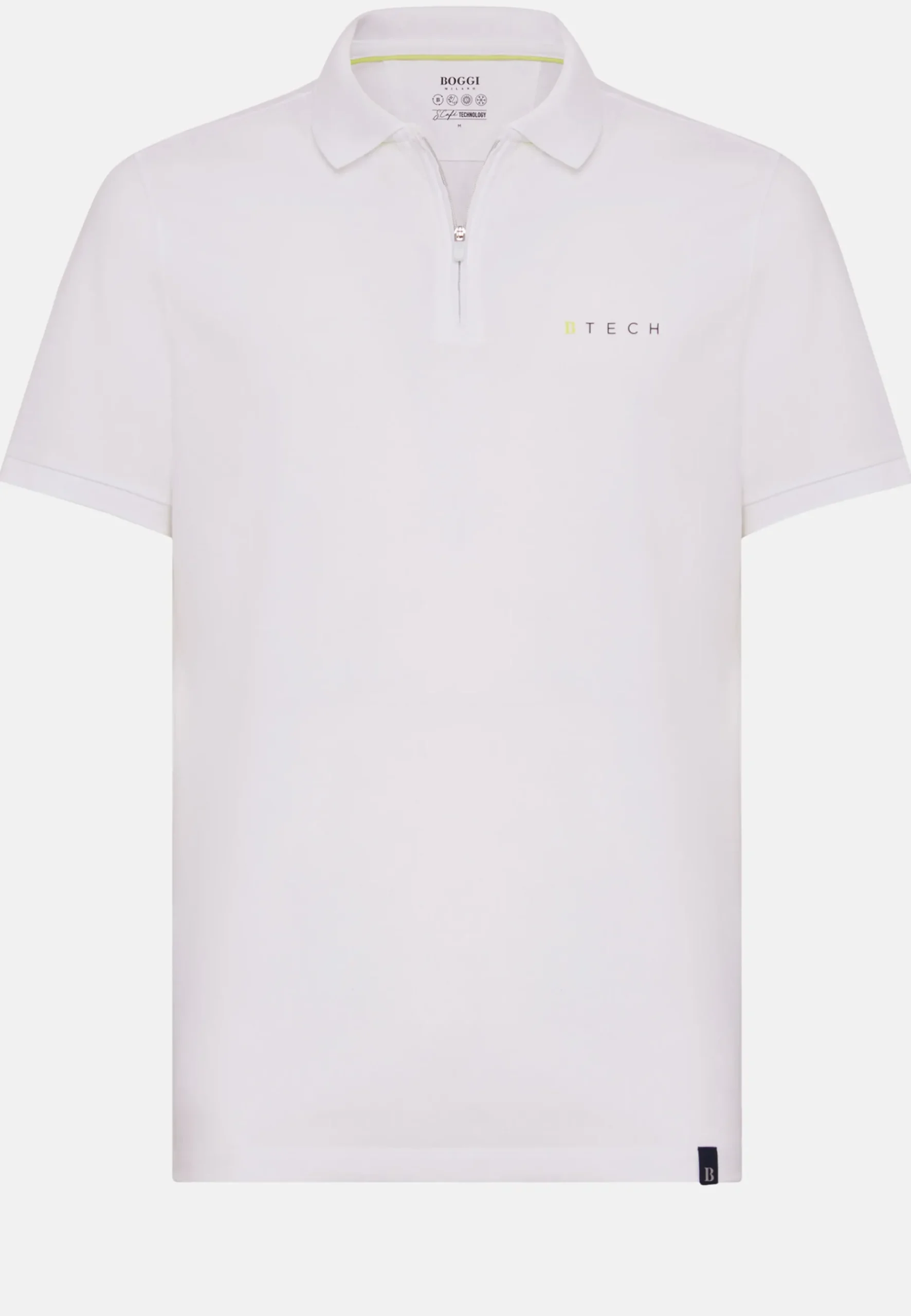 Ce modèle de polo présente un zip à l’avant avec tirette marquée du logo, une impression en caoutchouc du logo B Tech sur la poitrine, la broderie B Sustainable sur le côté arrière gauche et le B de Boggi appliqué à gauche en bas du vêtement.