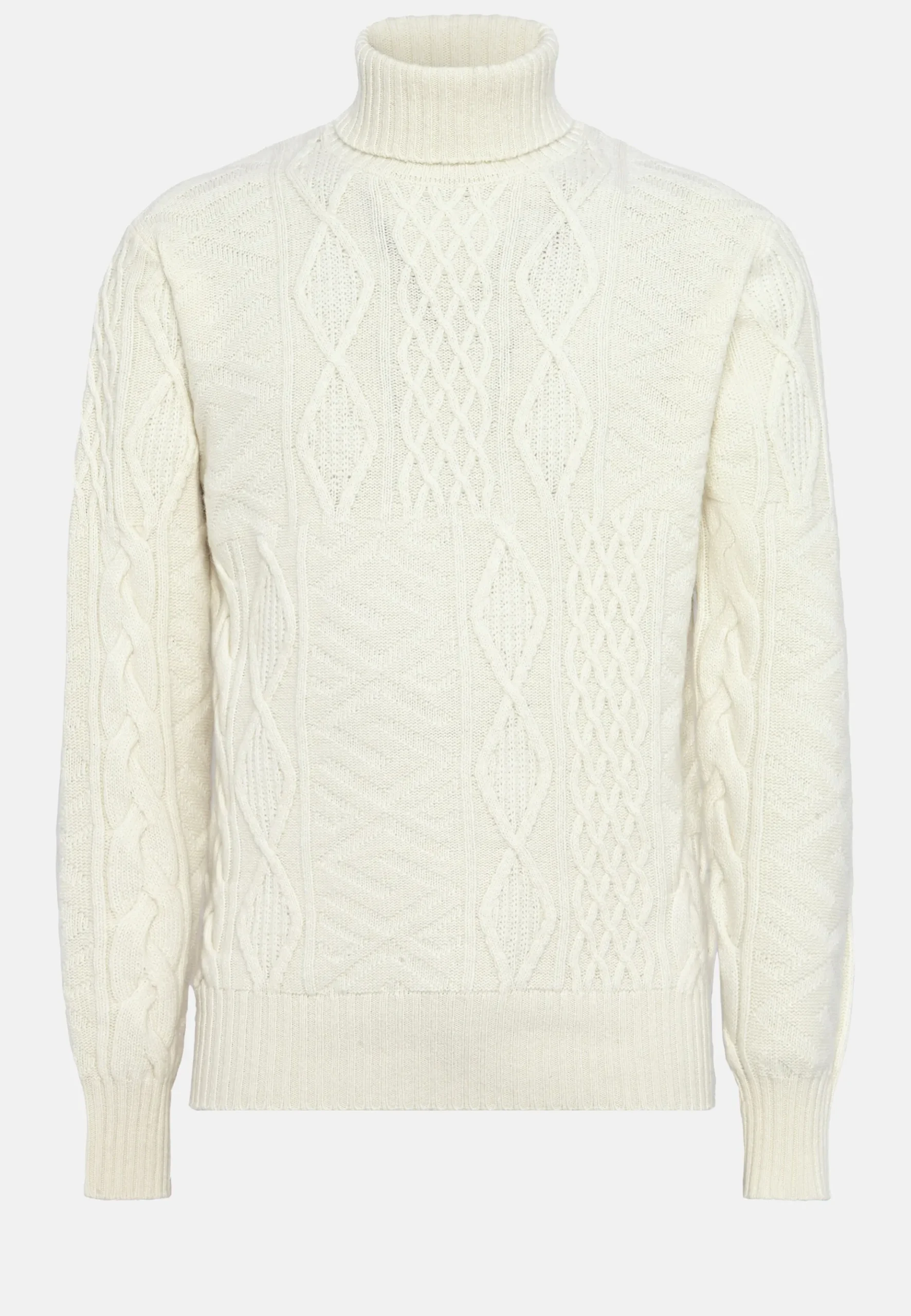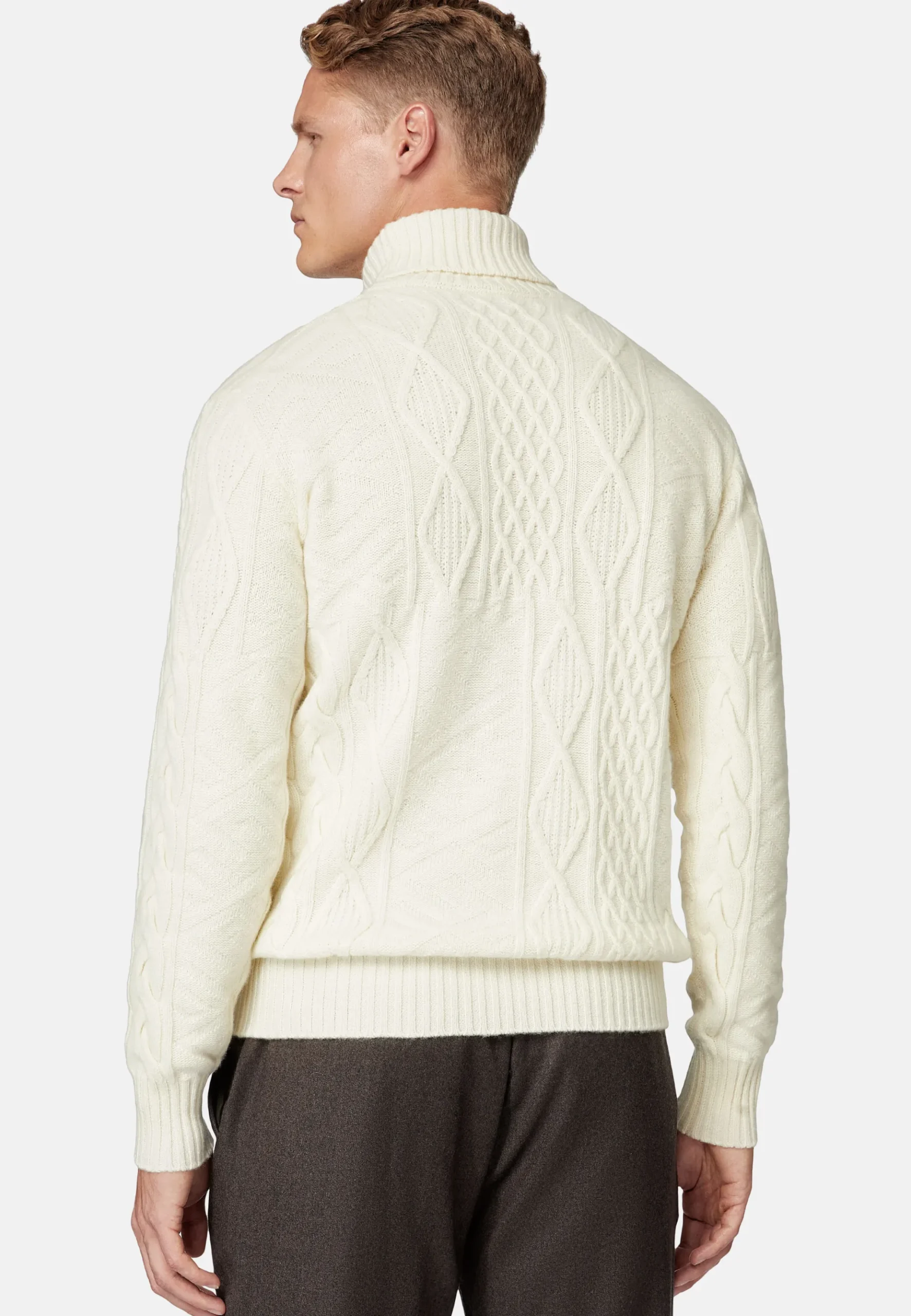 Le vêtement présente des tresses et un mélange de points, et une finition côtelée du col, des poignets et du bas.