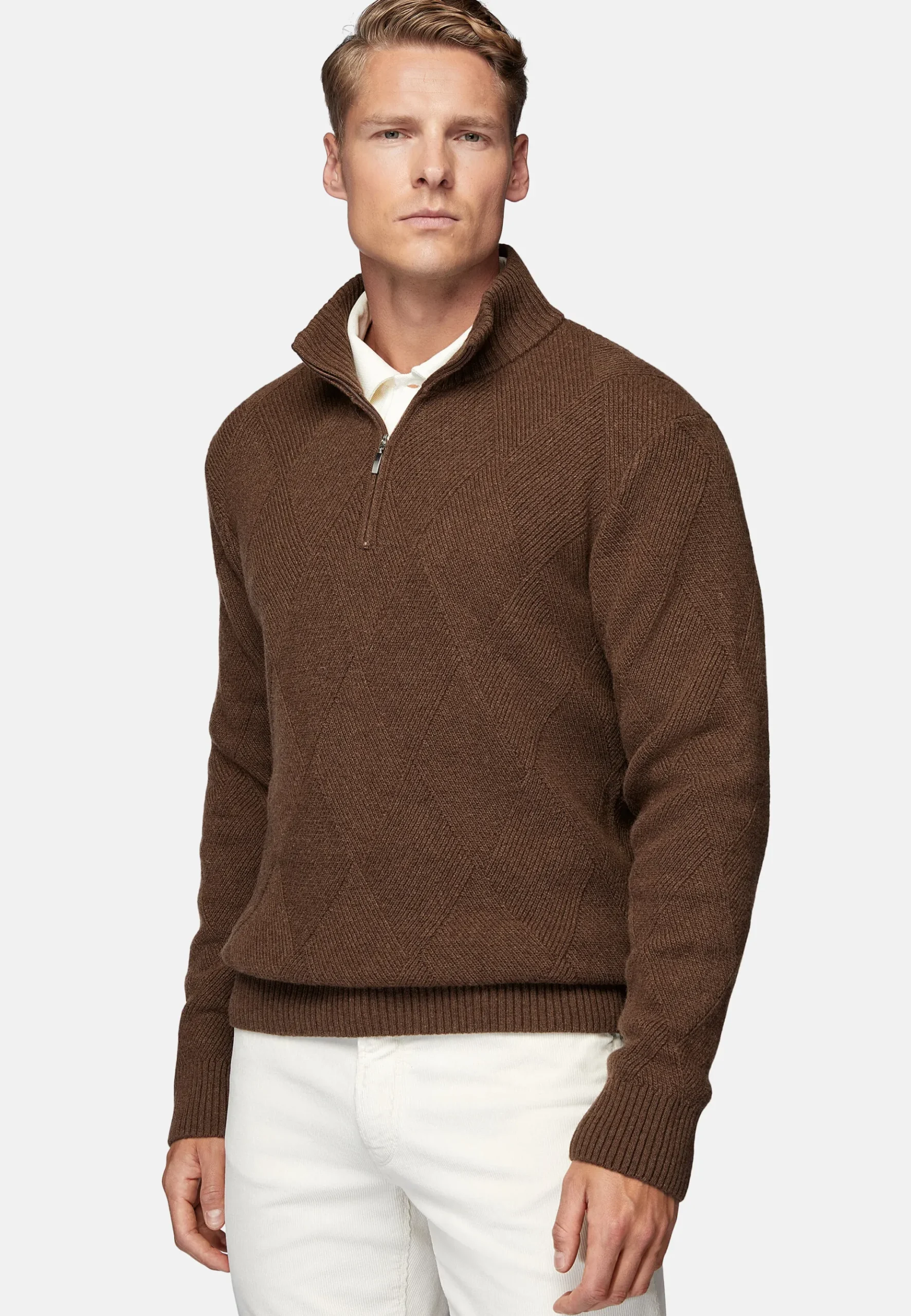 Le vêtement présente une réalisation jacquard avec motif géométrique et des côtes au niveau du col, des poignets et du bas.