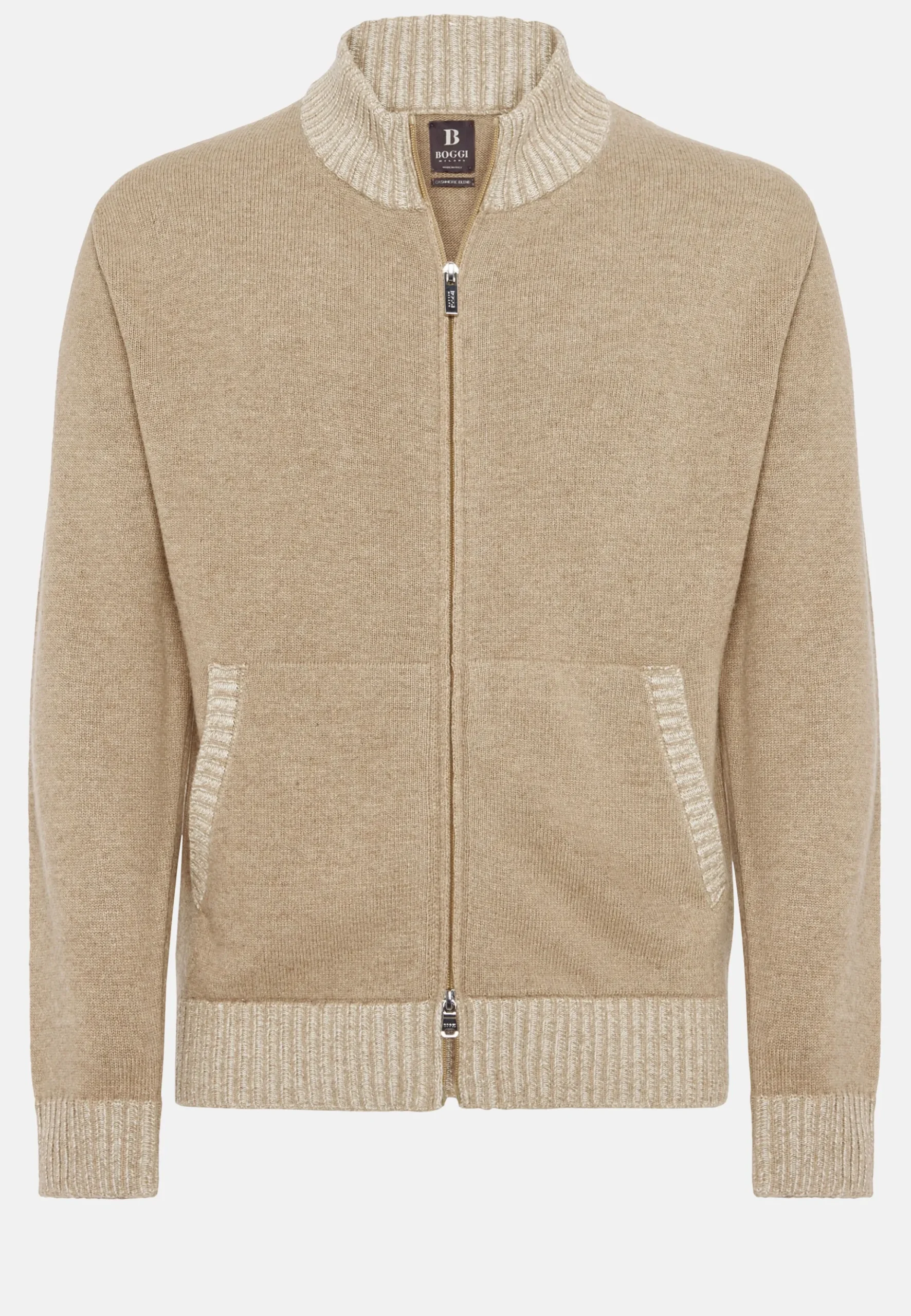 Le vêtement présente des finitions en côtes anglaises vanisées aux poignets et au bas.