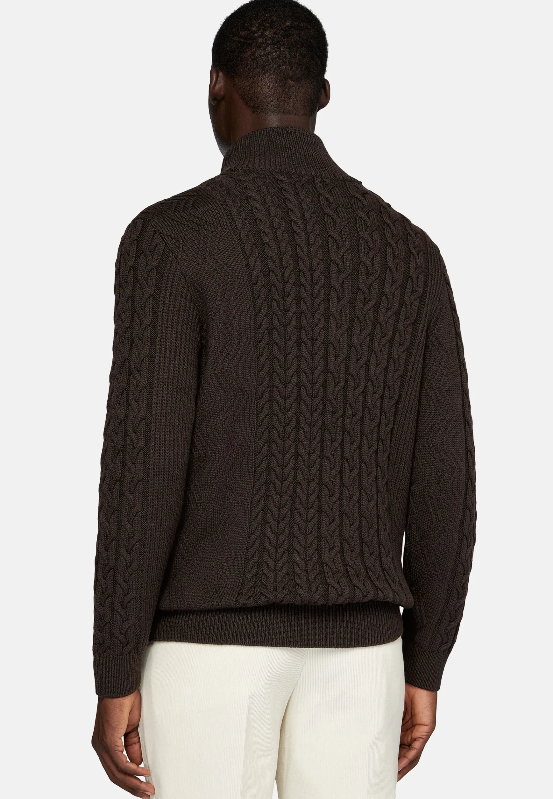 Le vêtement présente un tricot avec torsades et mélange de points, et une fermeture zippée avec tirettes logotées.