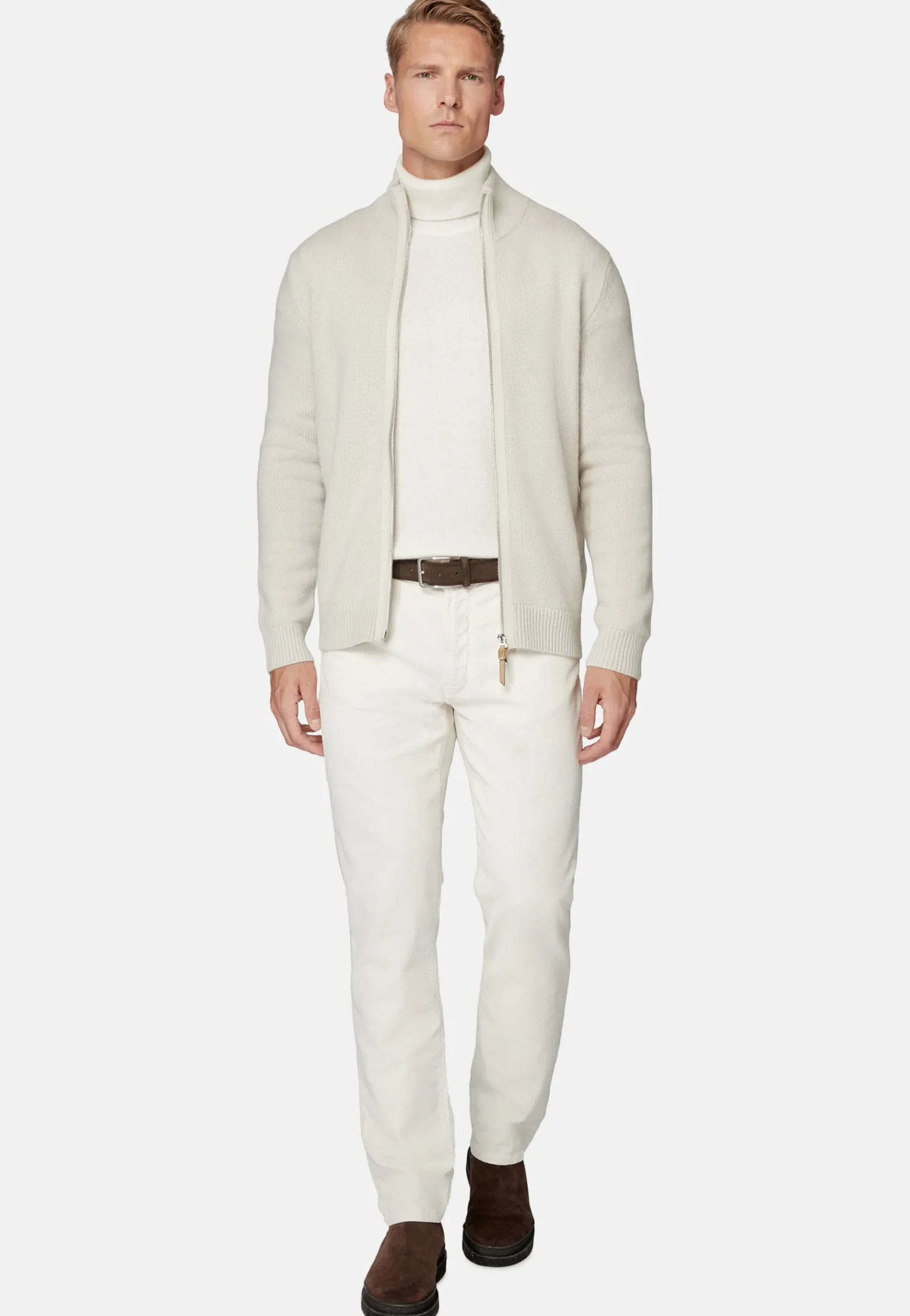 Le vêtement présente une fermeture éclair avec finition en faux daim et une tirette logotée avec le B de Boggi en cuir véritable.