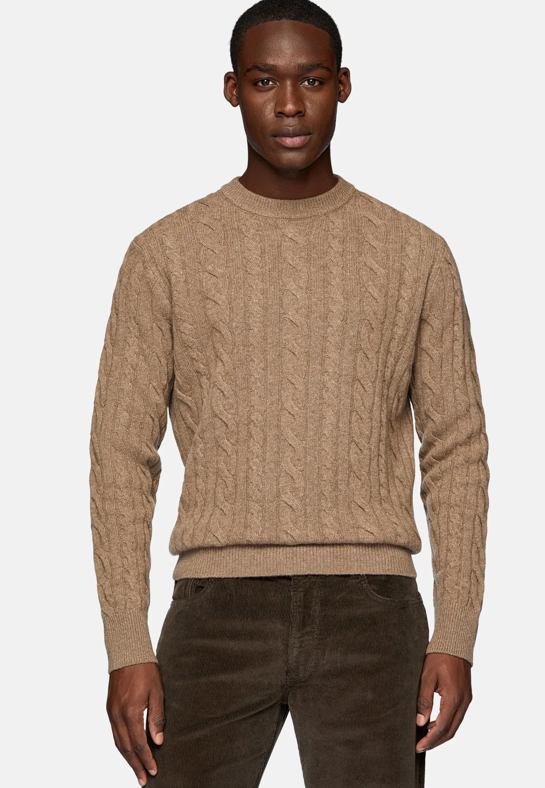 Le vêtement présente des torsades ainsi qu’un col, des poignets et un ourlet côtelés.