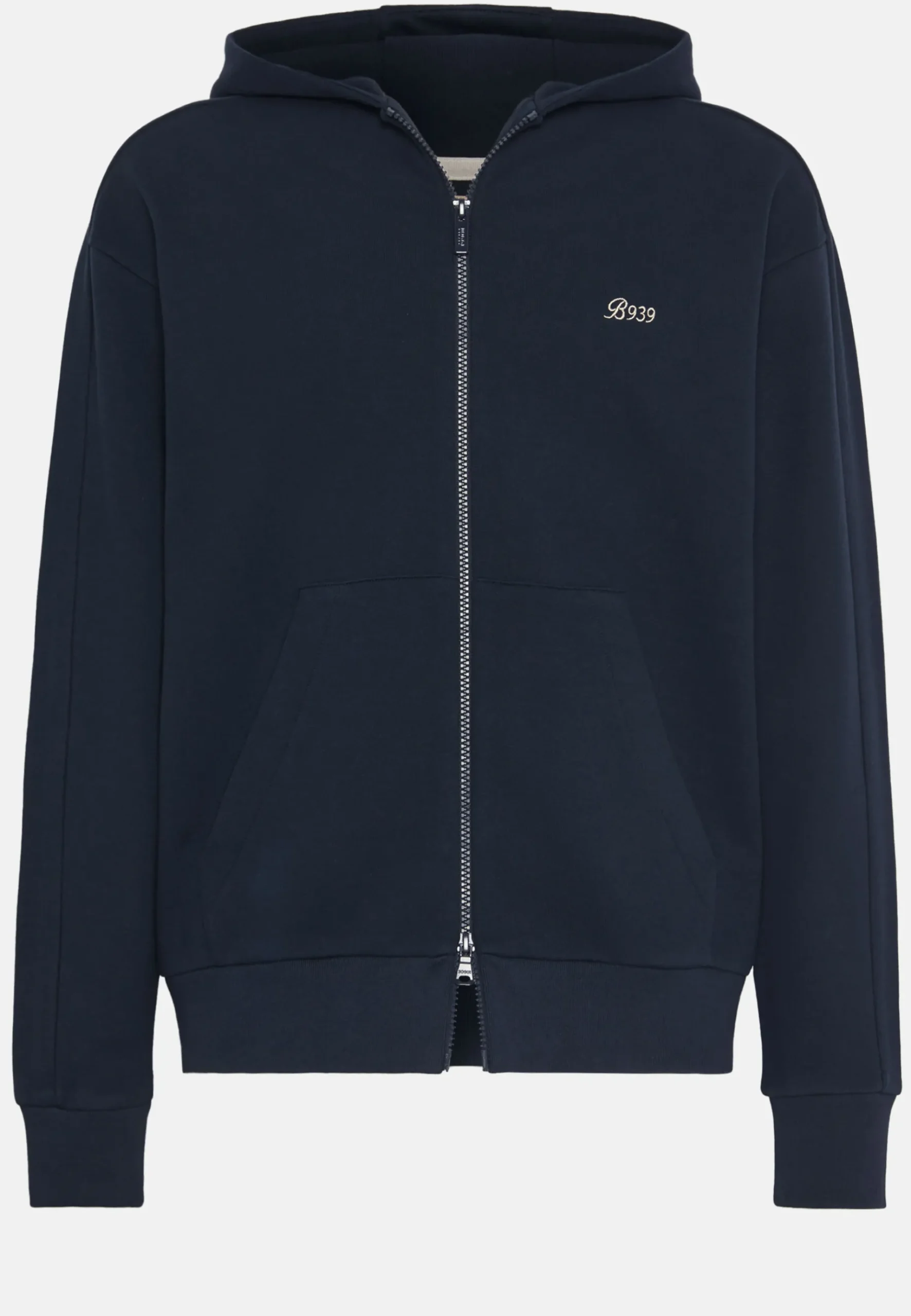 Le modèle présente des finitions en côtes en bas et aux poignets, un zip avec tirette au logo, une couleur contrastée sur la face intérieure de la capuche, le logo B939 brodé sur la poitrine et la broderie B Sustainable du côté gauche à l’arrière du vêtement.